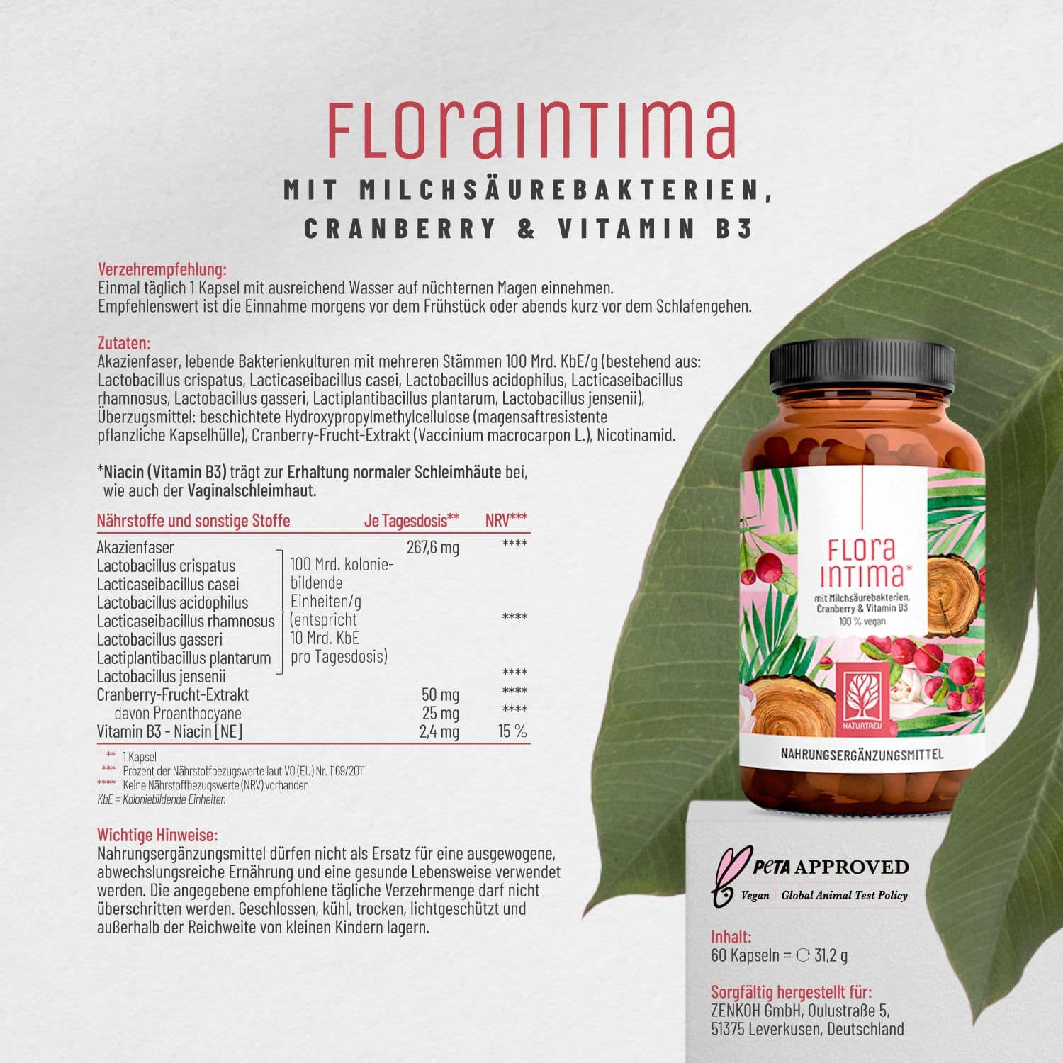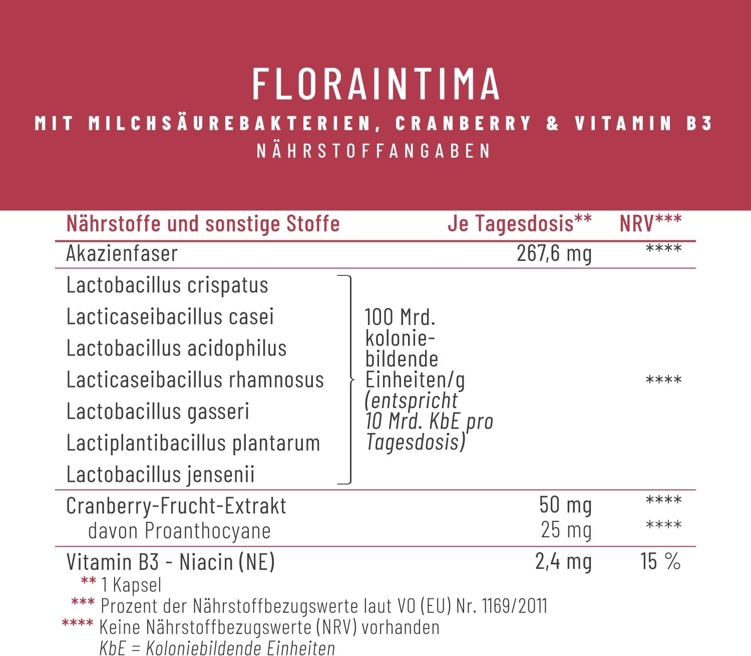 | Zutaten | Akazienfaser, lebende Bakterienkulturen mit mehreren Stämmen 100 Mrd. KbE/g (bestehend aus: Lactobacillus crispatus, Lacticaseibacillus casei, Lactobacillus acidophilus, Lacticaseibacillus rhamnosus, Lactobacillus gasseri, Lactiplantibacillus plantarum, Lactobacillus jensenii), Überzugsmittel: beschichtete Hydroxypropylmethylcellulose (magensaftresistente pflanzliche Kapselhülle), Cranberry-Frucht-Extrakt (Vaccinium macrocarpon L.), Nicotinamid |