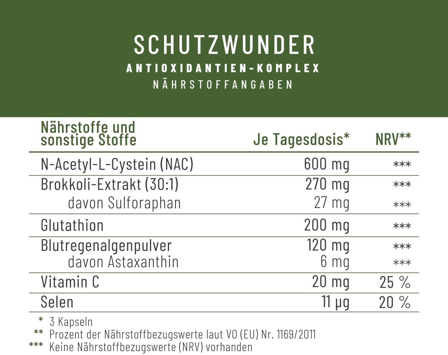 | Zutaten | N-Acetyl-L-Cystein, Überzugsmittel: Hydroxypropylmethylcellulose (pflanzliche Kapselhülle), Brokkoli-Extrakt (Brassica oleracea italica), Reismehl, reduziertes L-Glutathion, Blutregenalgenpulver (Haematococcus pluvialis), Calcium-L-Ascorbat, Selenomethionin |