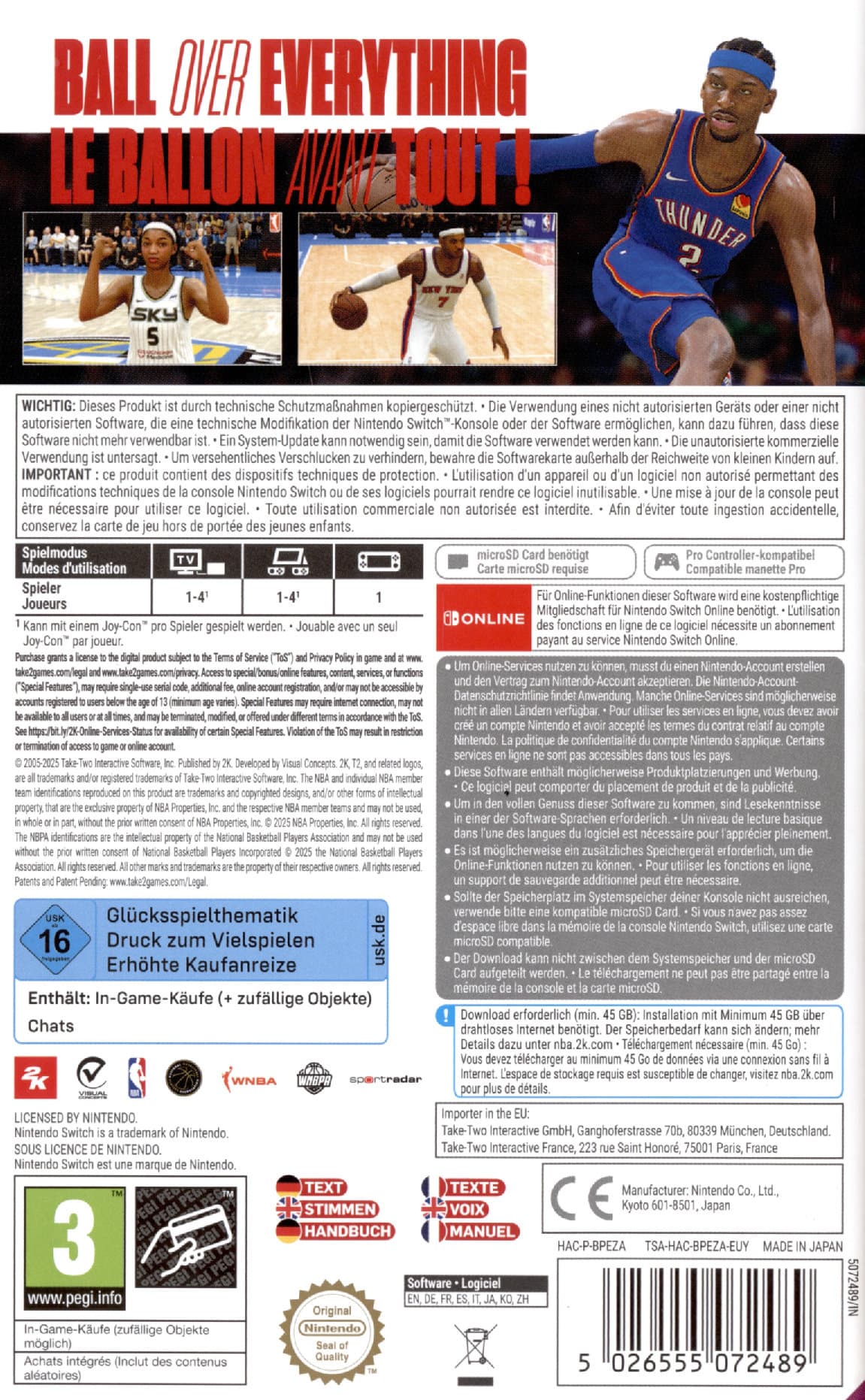 BALL OVER EVERYTHING Spiele um Ruhm und Ehre in Meine KARRIERE*, MyTEAM, Meine LIGA und Jetzt spielen. Zeige dein spielerisches Können mit verbessertem Gameplay und fordere deine Freunde oder Rivalen in den Wettbewerbsmodi von NBA 2K26 heraus. Lass keine Zweifel daran, dass du der Beste bist! DOMINIERE DAS GESCHEHEN Erlebe ein verbessertes Gameplay und eine authentische Steuerung, mit der du deine Offensive perfekt organisieren und das Spieltempo bestimmen kannst. Dank fließender und dynamischer Bewegungen bleibst du stets im Rhythmus, während eine verbesserte Wurfmechanik die gegnerische Verteidigung verzweifeln lässt. Mit blitzschnellen Spielzügen stellst du im Einzel- und Mehrspielermodus dein Können unter Beweis. FÜHRE DEIN TEAM ZUM SIEG Mach dich selbst zur Legende in Meine KARRIERE und entwickle einen Mein SPIELER, der eine NBA-Franchise in die Finals bringen kann. Erziele individuelle und Teamerfolge, hänge Banner auf und spiele dich in die Hall of Fame. Schließe dich mit Freunden zusammen und fordere gegnerische Teams heraus, um ihnen zu zeigen, wer der Beste ist. VEREINE STARS IN MyTEAM Sammle ehemalige und aktuelle Basketball-Legenden in MyTEAM und tritt gemeinsam mit ihnen zu packenden Spielen an. Stelle einen Kader voller Stars zusammen, nimm mit deinem Traumteam alle Herausforderungen in Einzel- und Mehrspielermodi an und hol dir neue Karten, um alle deine MyTEAM-Träume Wirklichkeit werden zu lassen. DEIN TEAM, DEINE GESCHICHTE Schreibe das nächste Kapitel einer NBA-Franchise als General Manager in Meine LIGA. Beeinflusse die Zukunft des Sports und hinterlasse deine unauslöschlichen Spuren in der Liga. Jetzt spielen, Meine NBA, The W und Meine Liga sind offline verfügbar. Alle anderen Spielmodi und Funktionen erfordern eine Internetverbindung und möglicherweise die Registrierung für ein Online-Konto (variiert, ab 13 Jahren). Internet-Download (45GB) erforderlich, microSD-Card wird benötigt. * Internetverbindung und NBA 2K-Konto erforderlich, um die Bonus-Inhalte erhalten und nutzen zu können. Spielsprache Englisch, Bildschirmtext Deutsch