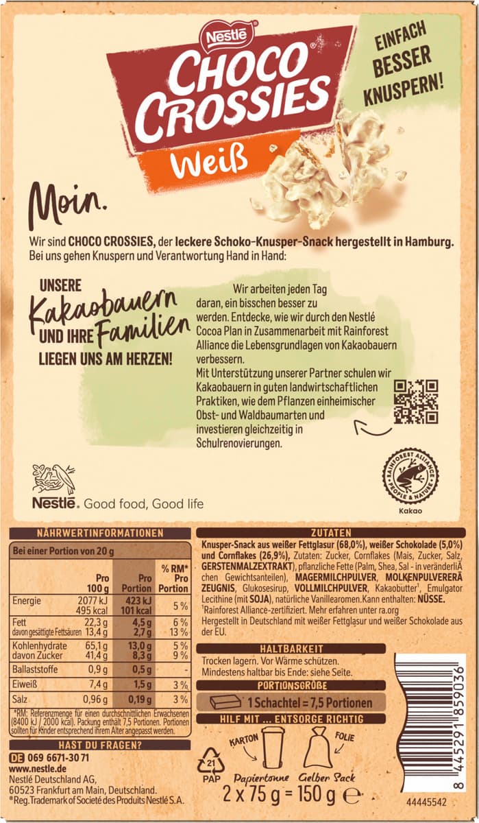 CHOCO CROSSIES White Lass es knuspern! Knusprige Flakes, umhüllt von cremiger weißer Glasur. Der besondere Nestlé-Klassiker CHOCO CROSSIES White sorgt für ein einzigartiges Knusper-Erlebnis. • Unser besonderer Klassiker mit knusprigen Flakes in cremiger weißer Glasur • Die Kombination aus Cremigkeit und Knusprigkeit sorgt für ein tolles Geschmackserlebnis • Knuspriger Genuss für Groß und Klein • 100% Kakao aus nachhaltiger Beschaffung: Glasur mit Kakao aus Rainforest Alliance-zertifizierten Bohnen hergestellt