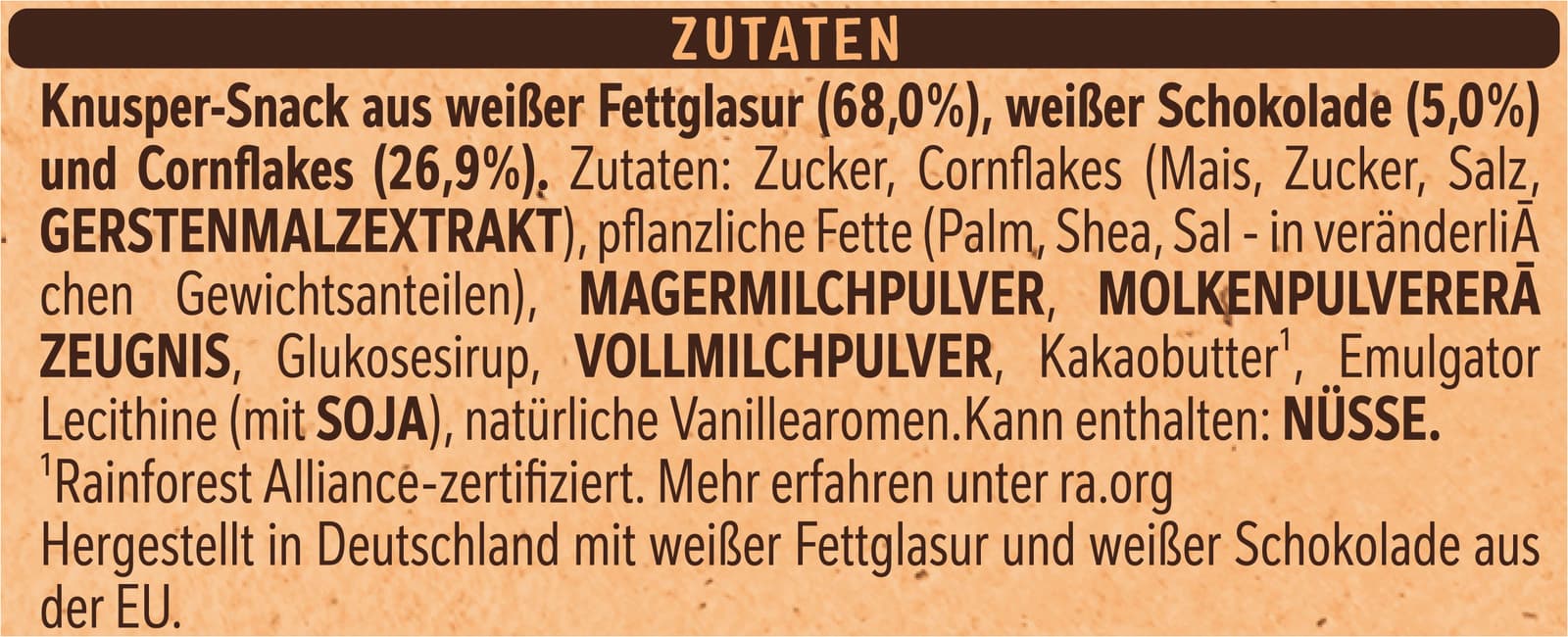| Zutaten | Zucker, Cornflakes (Mais, Zucker, Salz, GERSTENMALZEXTRAKT), pflanzliche Fette (Palm, Shea, Sal - in veränderlichen Gewichtsanteilen), MAGERMILCHPULVER, MOLKENPULVERERZEUGNIS, Glukosesirup, VOLLMILCHPULVER, Kakaobutter*, Emulgator Lecithine (mit SOJA), natürliche Vanillearomen. Kann enthalten: NÜSSE. *Rainforest Alliance-zertifiziert. |