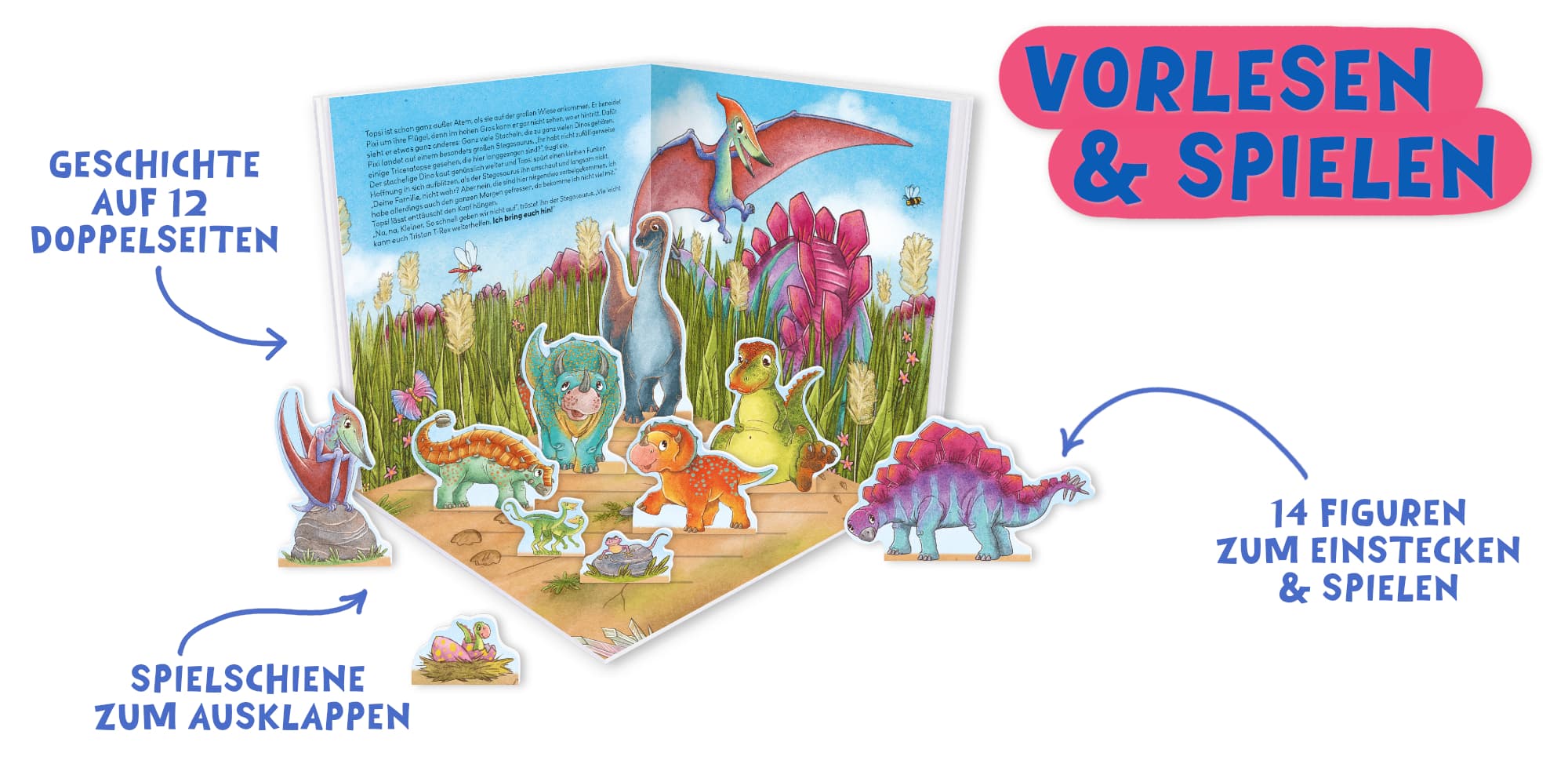 Das Kinderbuch enthält 14 Steckfiguren, die passend zur Geschichte nach und nach herausgenommen werden können. Auf der integrierten Spielschiene lassen sich die Figuren arrangieren und Szenen aus dem Dinoland nachspielen. Die farbenfroh illustrierten Seiten des Buchs dienen dabei als lebendige Hintergründe.