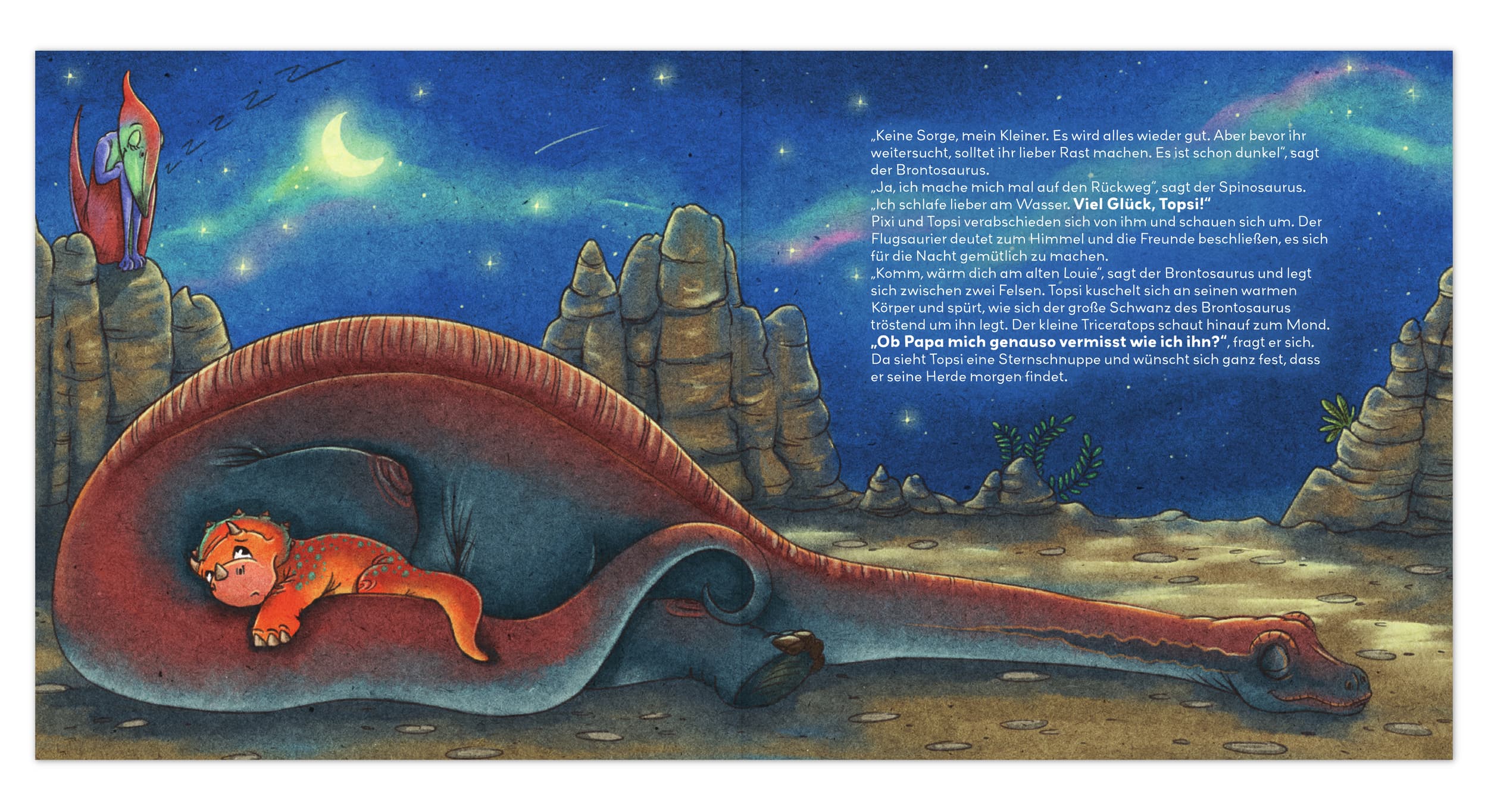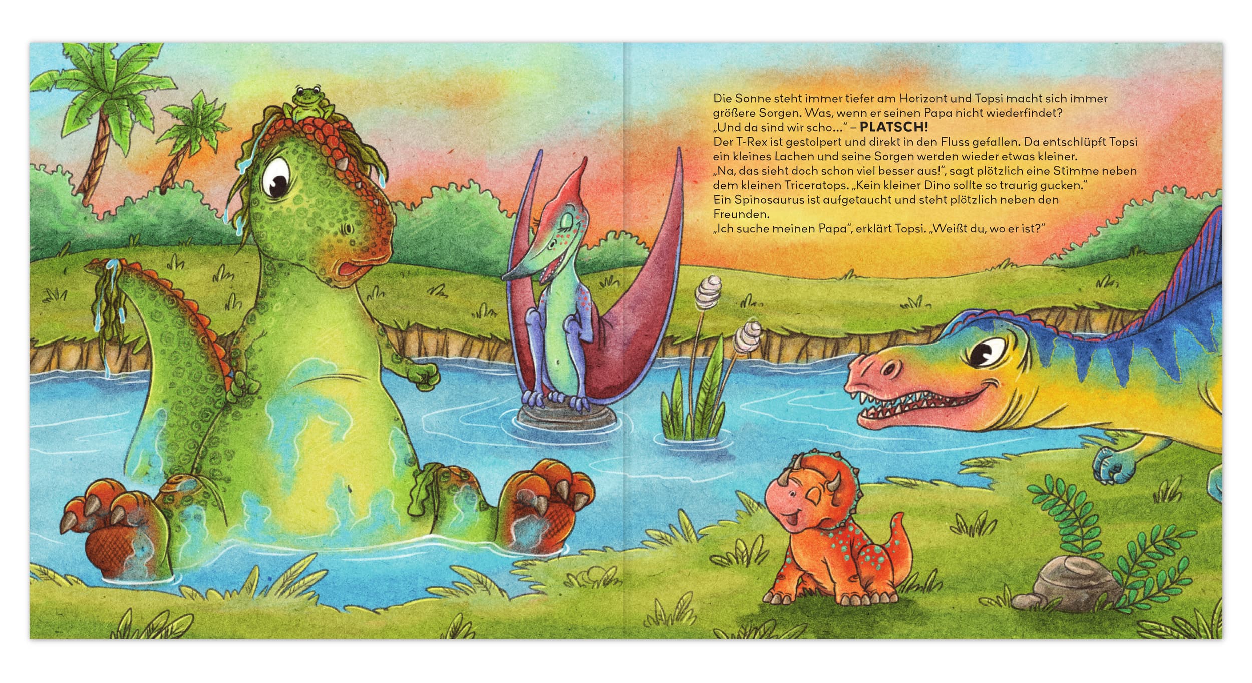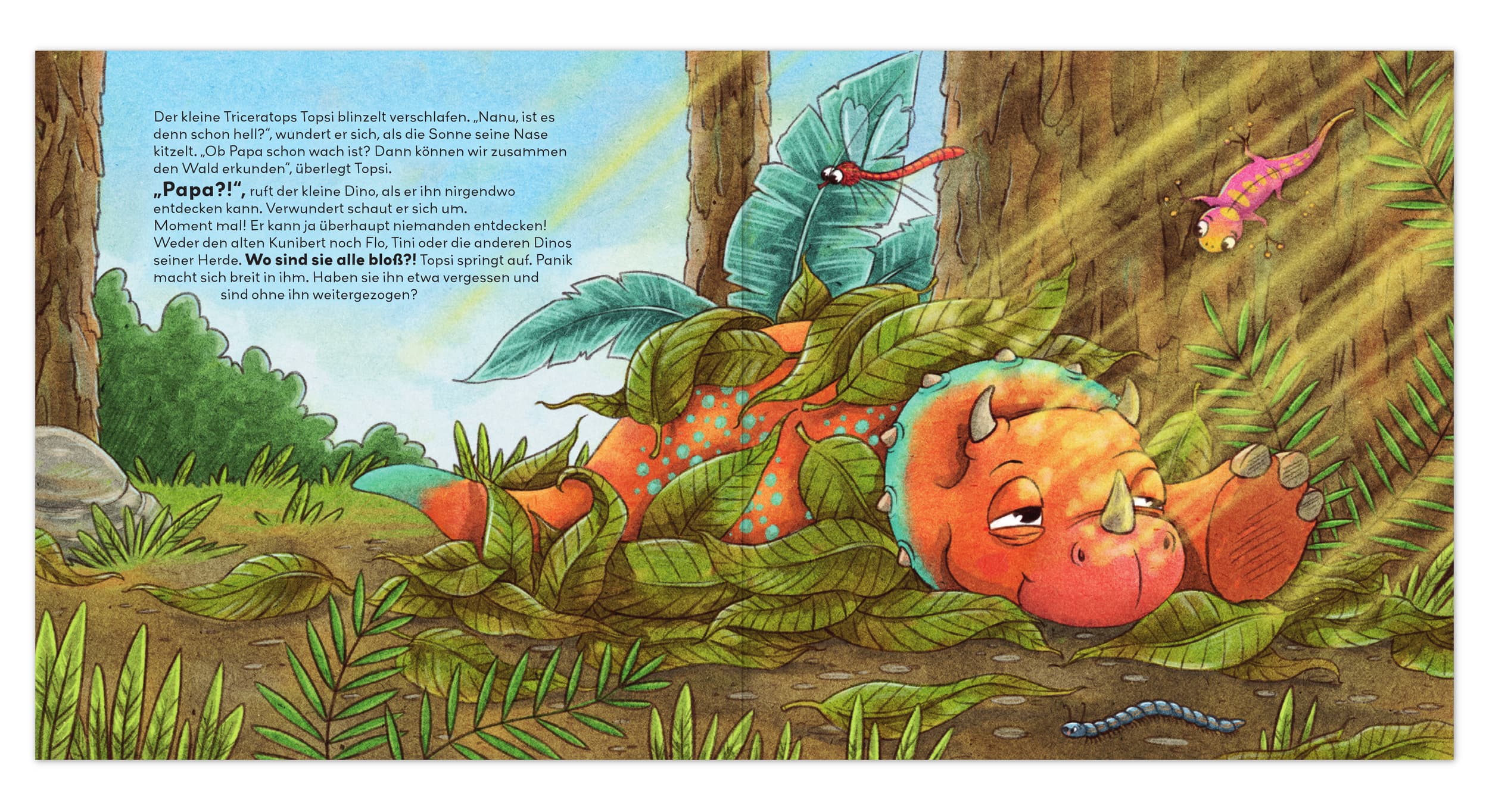 Verschlafen wacht Dino Topsi im Wald auf – doch plötzlich ist niemand mehr da! Wo sind seine Familie und die Freunde geblieben? Auf seiner Suche nach ihnen erlebt Topsi viele spannende Begegnungen und lernt neue Dino-Freunde kennen. Gemeinsam entdecken sie das Dinoland, meistern kleine Abenteuer und helfen einander – eine Geschichte über Freundschaft, Zusammenhalt und Mut.