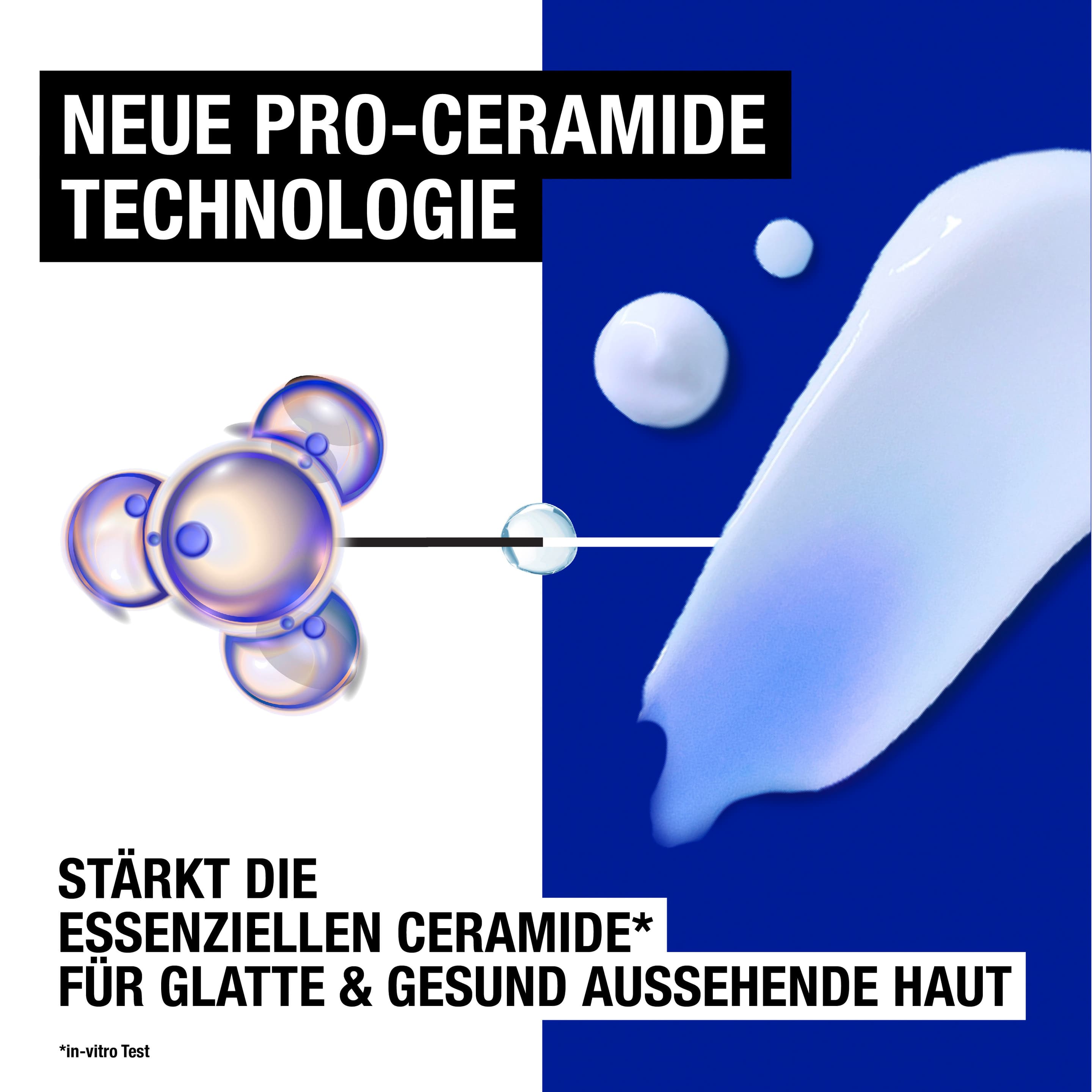 - Die NEUE Pro-Ceramide-Technologie der sofort einziehenden Körperlotion stärkt die essenziellen Ceramide der Haut, sodass 92% der Tester:innen ihre trockene Haut bereits nach der ersten Anwendung als weich, glatt und gesund aussehend empfanden***.