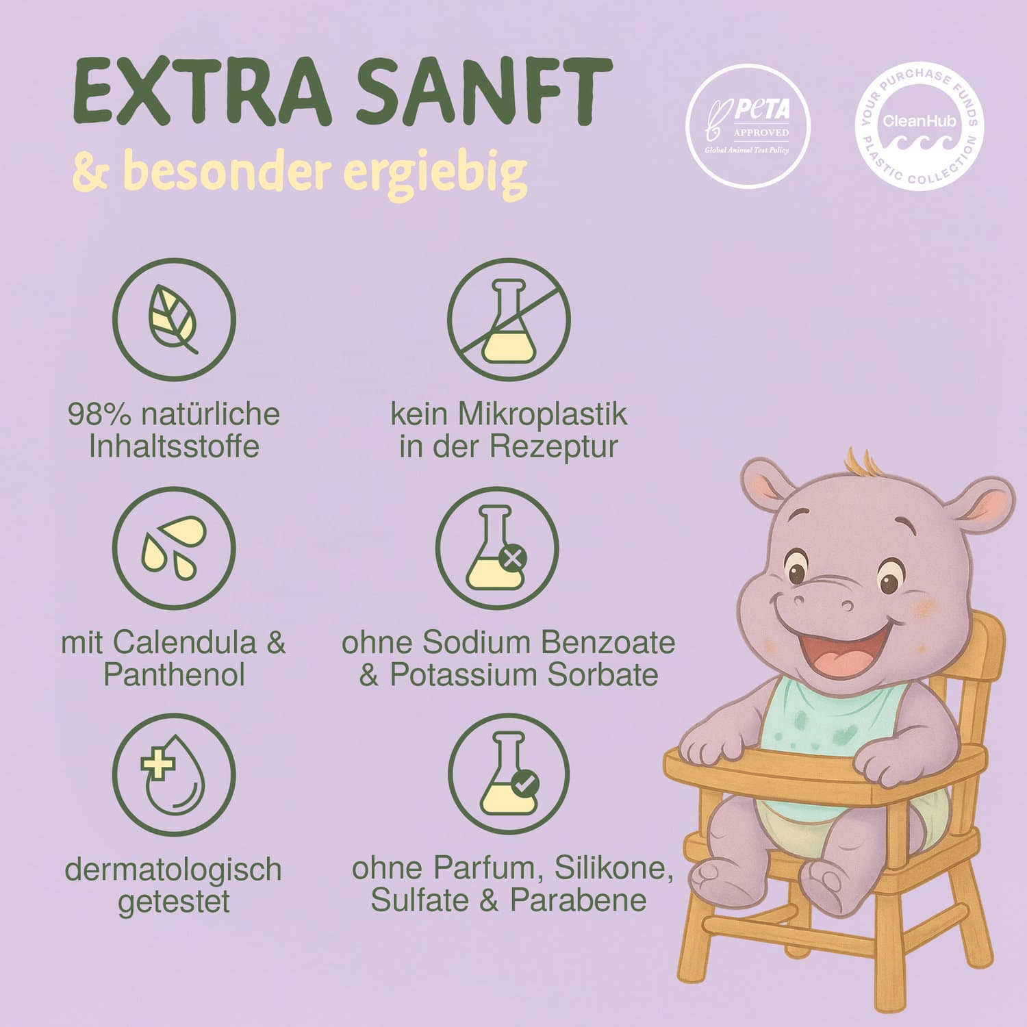 Mit seiner besonders sanften Formel reinigt der Feuchttuchschaum Super Nice Foam von nevernot die empfindliche Haut von Geburt an. Die milde, parfümfreie Rezeptur mit Calendula und Panthenol pflegt die zarte Babyhaut und ist ideal für Gesicht, Körper sowie den Windelbereich geeignet. Dabei wird bewusst auf Inhaltsstoffe wie Sodium Benzoate, Silikone oder Sulfate verzichtet.