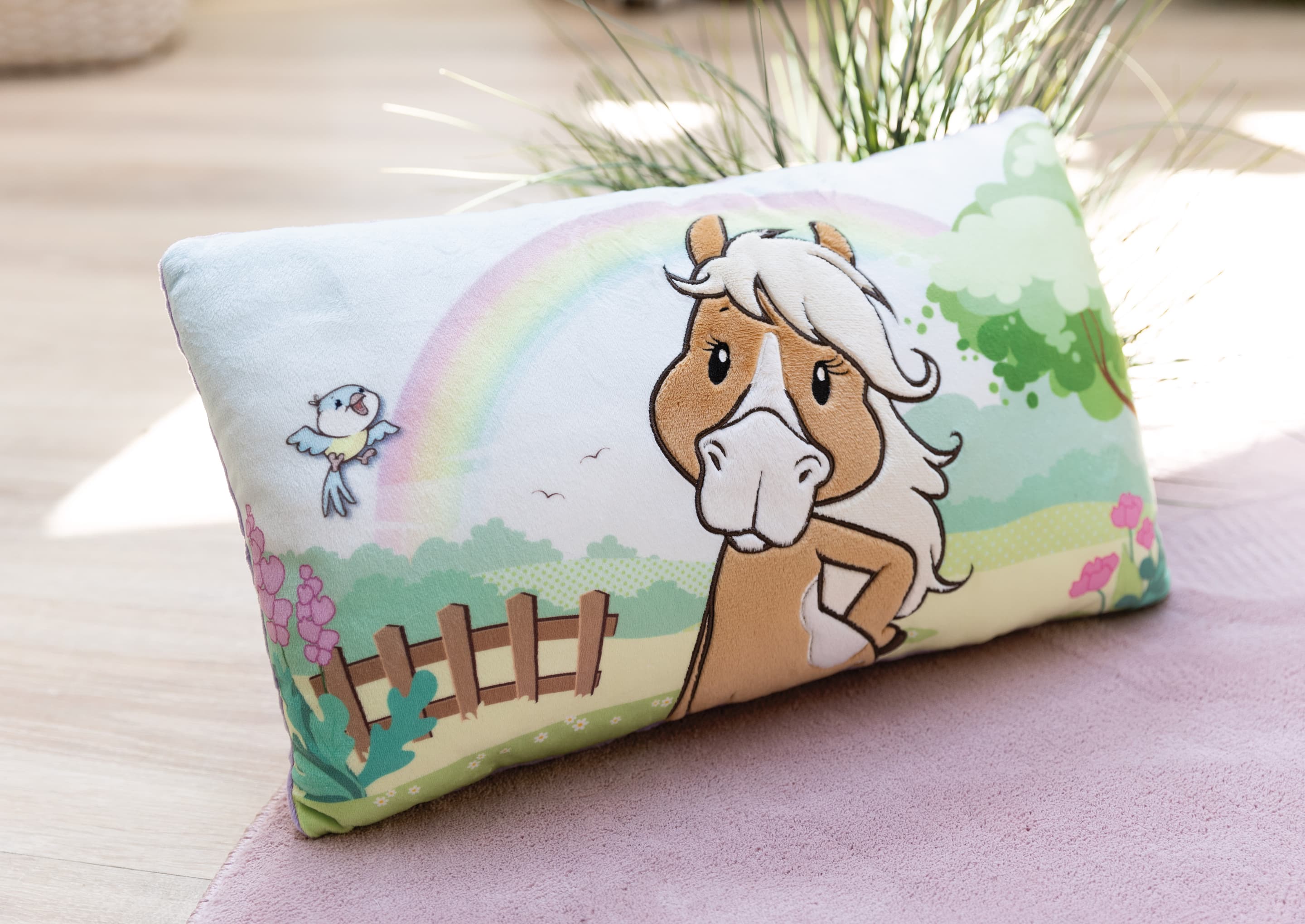 Das rechteckige Plüschkissen aus der Farm Friends-Kollektion von NICI ist die perfekte Mischung aus kuscheligem Komfort und niedlichem Design und wird garantiert zum Lieblingsstück jedes Pferdefans. Das Kissen ist nicht nur superweich, sondern zeigt auch das hübsche Gesicht des braunen NICI-Pferdes Holly K.Pony und eignet sich somit hervorragend als Dekoration für das Kinderzimmer, das Sofa oder einfach für jeden gemütlichen Platz. Die Rückseite des kuscheligen Kissens ist in einem zarten Lilaton gehalten. Das Kissen ist Teil der NICI GREEN-Produktwelt. Für NICI GREEN-Produkte verwenden wir fast ausschließlich Plüsch und Füllmaterial aus recycelten Materialien. Zu diesem Zweck werden vor allem recycelte PET-Flaschen zu RPET verarbeitet.