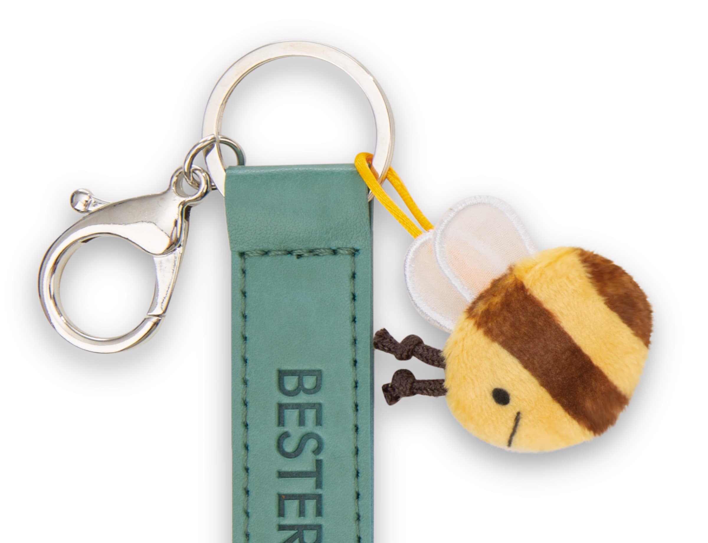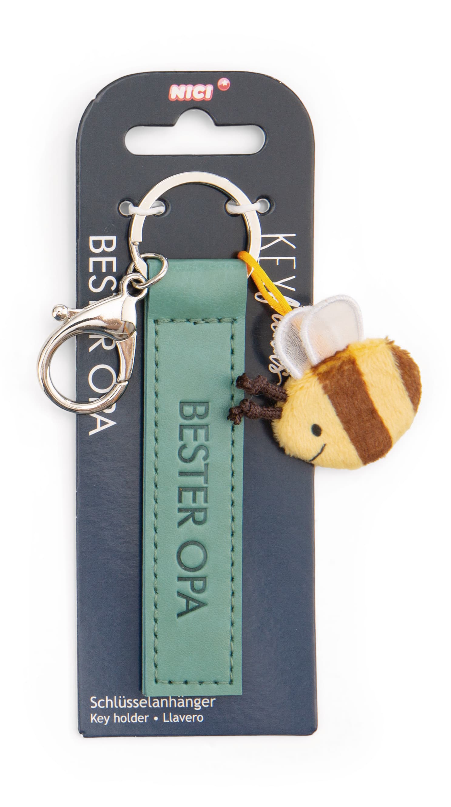 Als perfekter Begleiter für den Alltag zieht der grüne Schlüssel- und Taschenanhänger aus der Key Friends Kollektion von NICI alle Blicke auf sich! Der coole Anhänger mit Karabiner vereint Funktionalität mit modischem Design und ist ein echtes Fashion-Statement. Mit der geprägten Botschaft Bester Opa auf einem hochwertigen Kunstlederband setzt der Anhänger einen echten Lifestyle-Trend. Eine kleine, lustig gestreifte Biene aus Plüsch rundet das Gesamtbild ab und zaubert einen Hauch von Verspieltheit. Ob am Schlüsselbund, Rucksack, Koffer oder als modisches Accessoire – der Key Friends Schlüssel- und Taschenanhänger verleiht jedem Look das gewisse Etwas. Ideal als liebevolles Mitbringsel für den besten Opa der Welt!