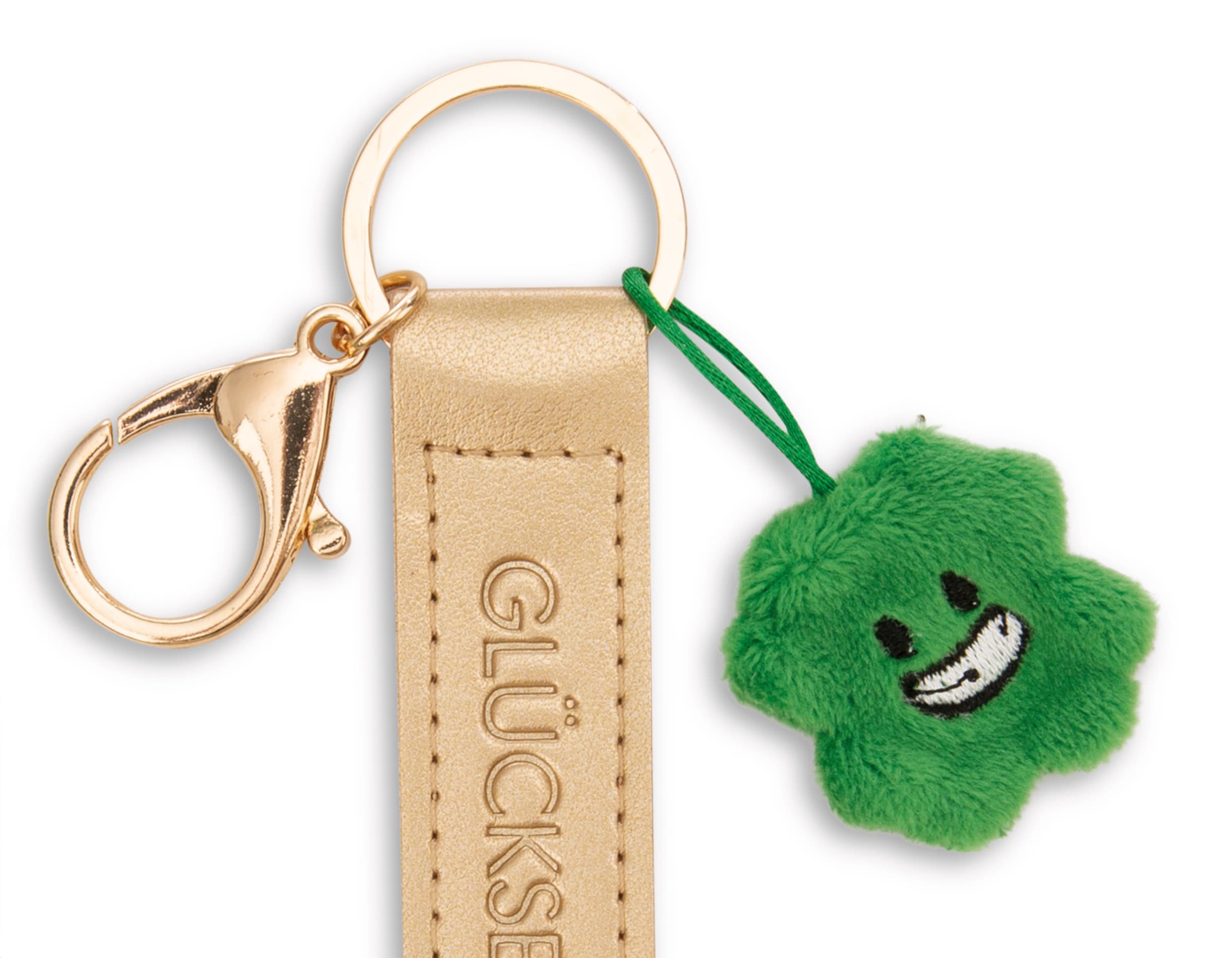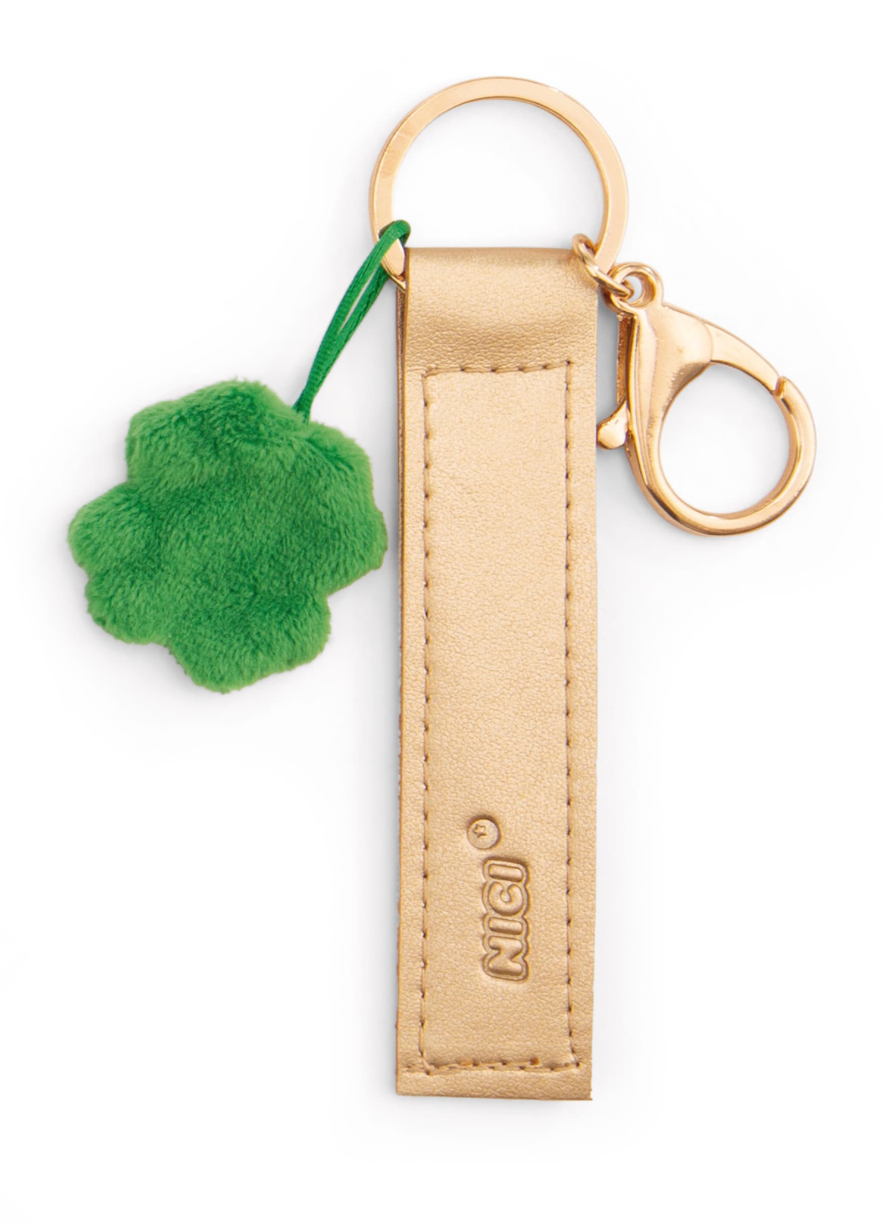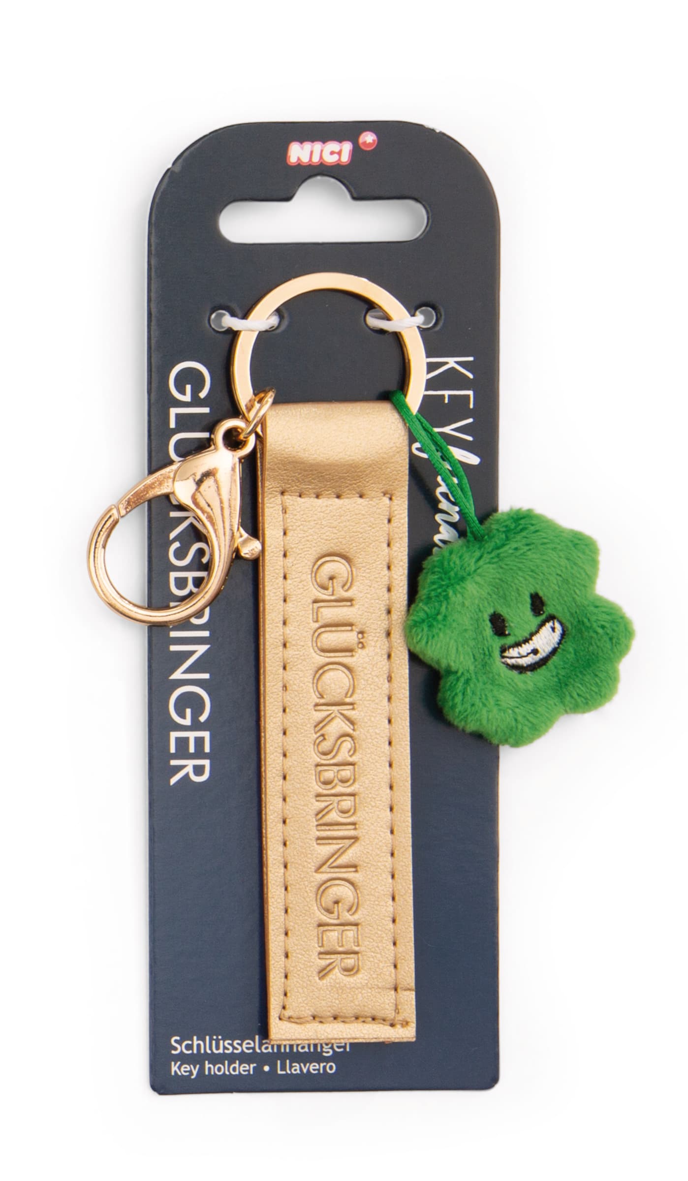 Als perfekter Begleiter für den Alltag zieht der goldfarbene Schlüssel- und Taschenanhänger aus der Key Friends Kollektion von NICI alle Blicke auf sich! Der coole Anhänger mit Karabiner vereint Funktionalität mit modischem Design und ist ein echtes Fashion-Statement. Mit der geprägten Botschaft Glücksbringer auf einem hochwertigen Kunstlederband setzt der Anhänger einen echten Lifestyle-Trend. Ein kleines, grünes Kleeblatt aus Plüsch rundet das Gesamtbild ab und zaubert einen Hauch von Verspieltheit. Ob am Schlüsselbund, Rucksack, Koffer oder als modisches Accessoire – der Key Friends Schlüssel- und Taschenanhänger verleiht jedem Look das gewisse Etwas. Ideal als Geschenk für sich selbst oder als liebevolles Mitbringsel für Freunde und Familie!