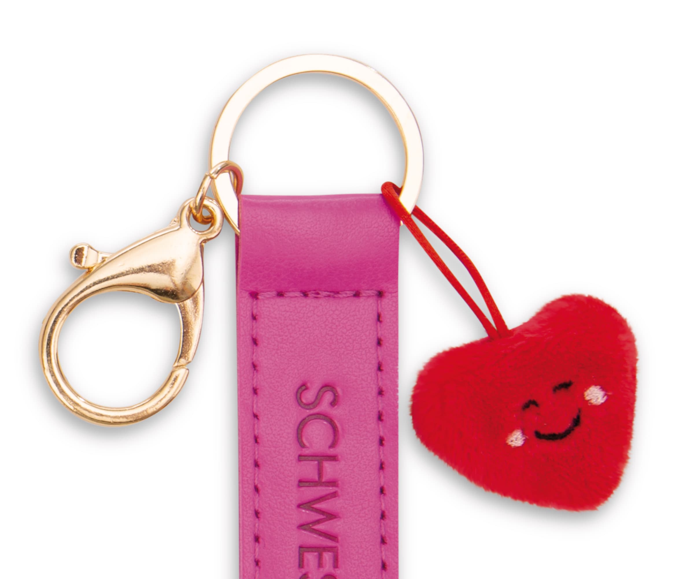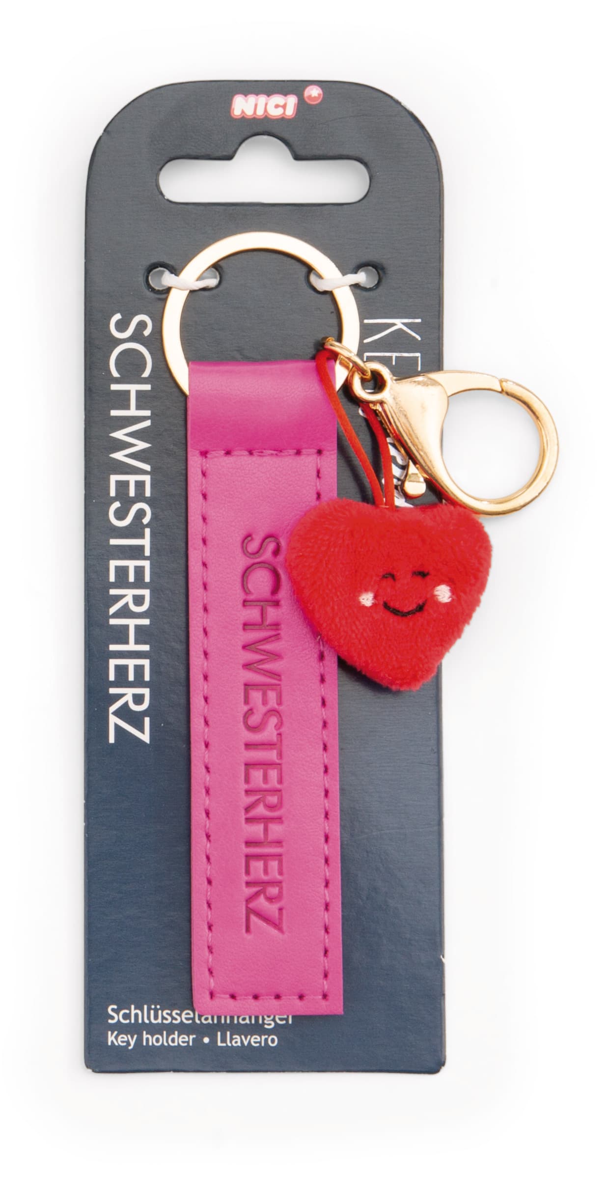 Als perfekter Begleiter für den Alltag zieht der pinkfarbene Schlüssel- und Taschenanhänger aus der Key Friends Kollektion von NICI alle Blicke auf sich! Der coole Anhänger mit Karabiner vereint Funktionalität mit modischem Design und ist ein echtes Fashion-Statement. Mit der geprägten Botschaft Schwesterherz auf einem hochwertigen Kunstlederband setzt der Anhänger einen echten Lifestyle-Trend. Ein kleines, rotes Herz aus Plüsch rundet das Gesamtbild ab und zaubert einen Hauch von Verspieltheit. Ob am Schlüsselbund, Rucksack, Koffer oder als modisches Accessoire – der Key Friends Schlüssel- und Taschenanhänger verleiht jedem Look das gewisse Etwas. Ideal als liebevolles Geschenk für die beste Schwester der Welt!