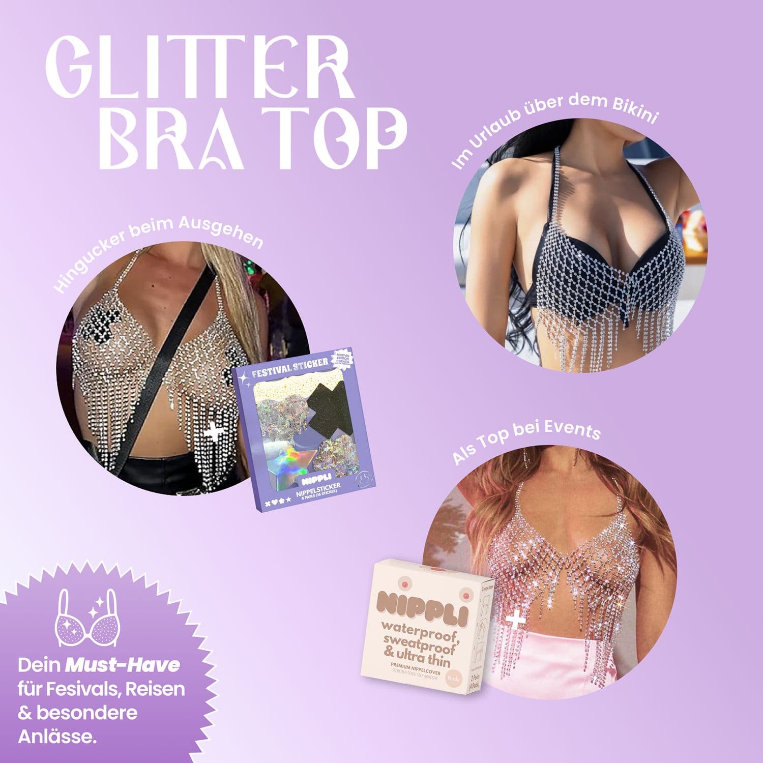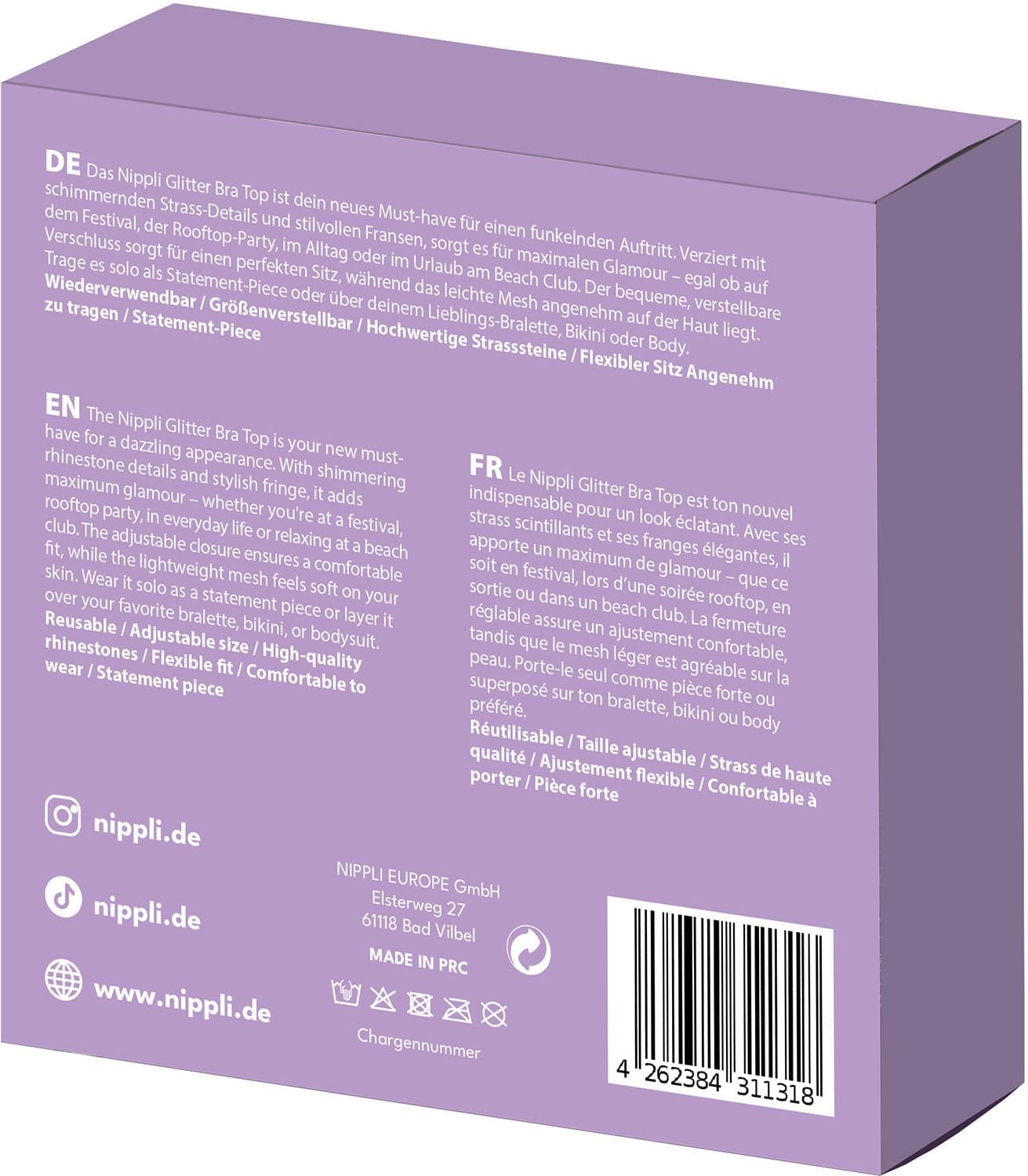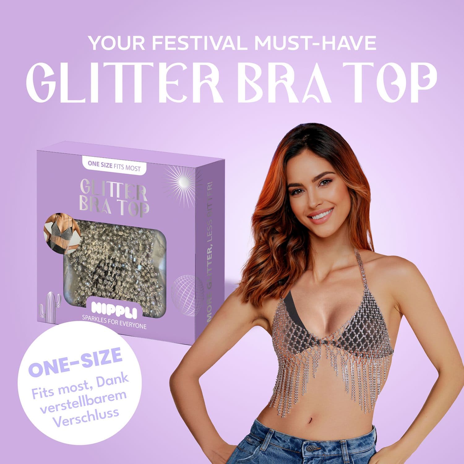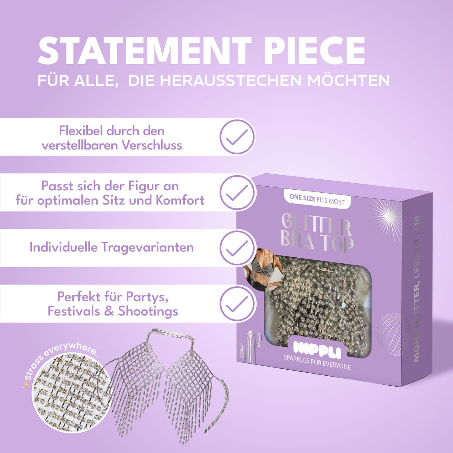 Das Nippli Glitter Bra Top ist dein neues Must-have für einen funkelnden Auftritt. Verziert mit schimmernden Strass-Details und stilvollen Fransen, sorgt es für maximalen Glamour - egal ob auf dem Festival, der Rooftop Party, im Alltag oder im Urlaub am Beach Club. Der bequeme, verstellbare Verschluss sorgt für einen perfekten Sitz, während das leichte Mesh angenehm auf der Haut liegt. Trage es solo als Statement-Piece oder über deinem Lieblings-Bracelette, Bikinie oder Body. Wiederverwendbar/ Größenverstellbar/ Hochwertige Strasssteine/ Flexibler Sitz angenehm zu tragen/ Statement-Piece