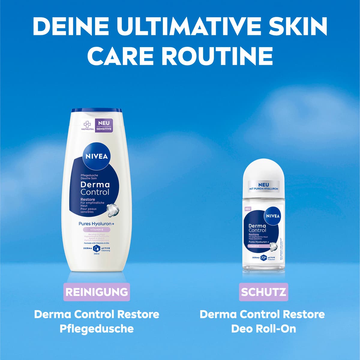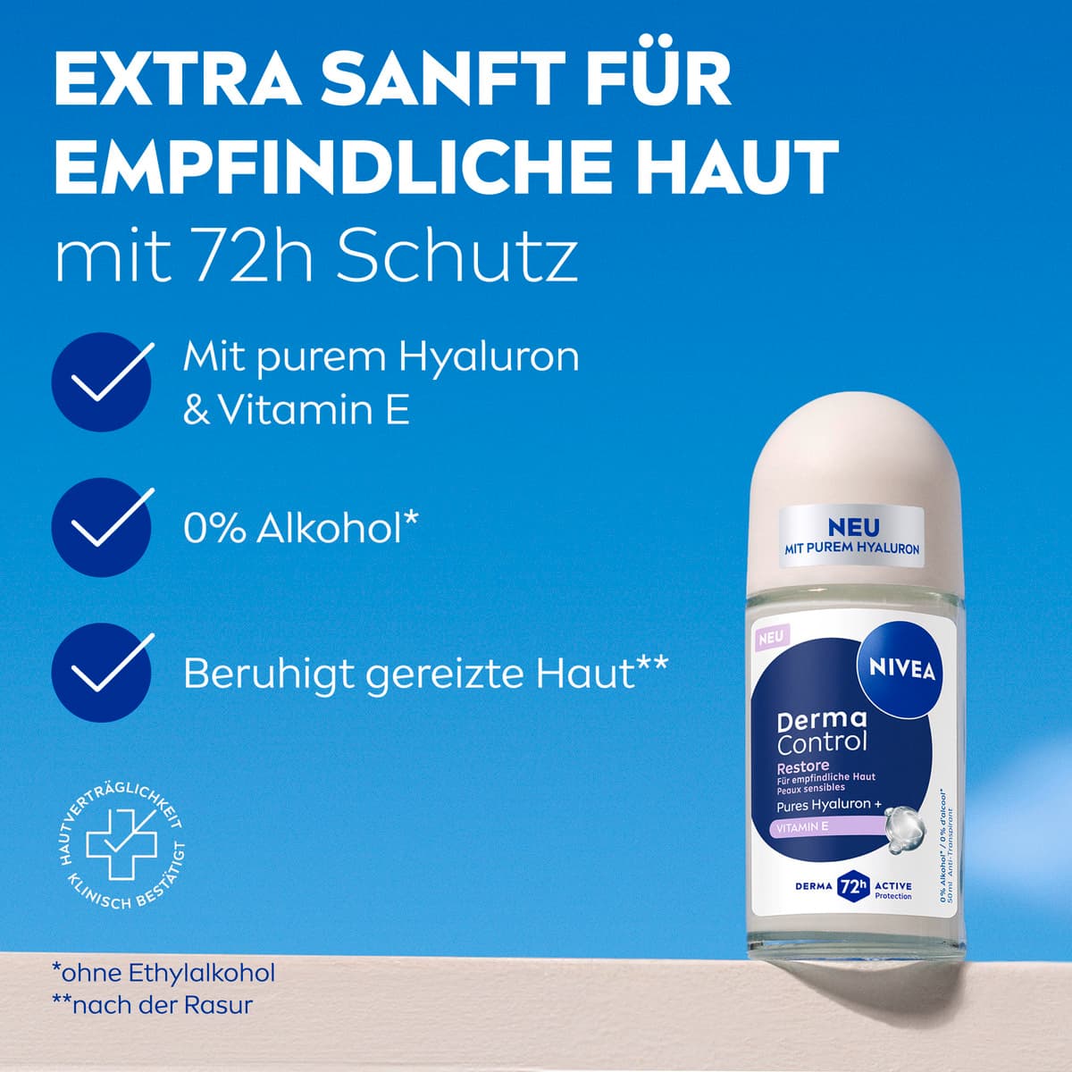 Die NIVEA Derma Control Restore Serie für empfindliche Haut enthält einen hypoallergenen Duft. Die Formel mit purem Hyaluron und Vitamin E beruhigt gereizte Haut effektiv und fördert die Erholung nach der Rasur für weiche, schöne Achseln und ein gesundes Hautgefühl. Das Anti-Transpirant bietet 72 Stunden Schutz: Die Formel arbeitet mit der Haut zusammen, um eine zuverlässige und starke Wirkung gegen Schweiß und Geruch zu erzielen und gleichzeitig deine Achseln zu pflegen. Alle unsere Produkte sind frei von Ethylalkohol, an empfindlicher Haut getestet und ihre Hautverträglichkeit ist dermatologisch nachgewiesen. NIVEA ist in mehr als 160 Ländern präsent und gehört mit mehr als 140 Jahren Erfahrung zu den größten und vertrauenswürdigsten Hautpflegemarken der Welt. Als Marktführer in der globalen Hautpflegebranche arbeiten unsere Forscher intensiv daran, hochwertige, dermatologisch geprüfte Produkte für verschiedene Hauttypen und -bedürfnisse anzubieten.