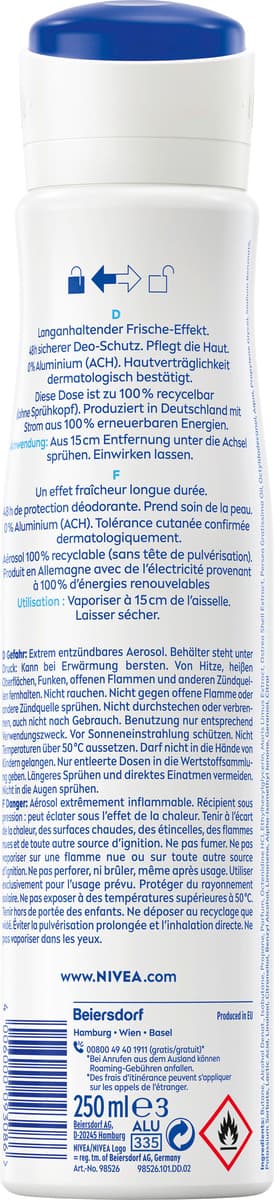 Das NIVEA Fresh Natural Deo Spray mit einzigartiger NIVEA INFINIFRESH Formel und 0% Aluminium (ACH) bekämpft aktiv geruchsverursachende Bakterien und sorgt für einen langanhaltenden Frische-Effekt, der länger als nur ein paar Stunden anhält. Die pflegende Formel mit Meeresextrakten bietet einen erstaunlichen, langanhaltenden frischen Duft und sorgt für ein sauberes und frisches Hautgefühl. Dermatologisch auf Hautverträglichkeit getestet, bieten unsere Deodorants Derma 48h Aktiv-Schutz: Sie arbeiten mit der Haut für zuverlässigen und effektiven Schutz gegen Schweiß und Geruch. NIVEA ist in über 160 Ländern präsent und gehört mit mehr als 140 Jahren Erfahrung zu den größten und vertrauenswürdigsten Hautpflegemarken der Welt. Als Marktführer in der globalen Hautpflegebranche arbeiten unsere Forscher intensiv daran, hochwertige, dermatologisch geprüfte Produkte für verschiedene Hauttypen und -bedürfnisse anzubieten.