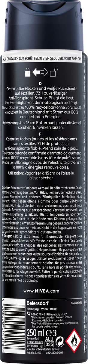 Die NIVEA MEN Black & White Invisible Reihe bietet Schutz vor weißen Rückständen auf schwarzer Kleidung und verhindert Gelbfärbung auf weißer Kleidung dank ihrer einzigartigen, patentierten Anti-Flecken-Technologie. Sie bietet zuverlässigen 72h Anti-Transpirant-Schutz, der stark gegen Schweiß und Gerüche wirkt. Die Hautverträglichkeit der Formeln ist dermatologisch getestet und enthält keinen Ethylalkohol. NIVEA MEN Black & White bietet umfassenden Schutz gegen Schweiß, Gerüche, Flecken, Rückstände und Irritationen, während es sanft zur Haut bleibt. Unsere Antitranspirantien bieten Derma 72h Aktiv-Schutz: Unsere Produkte arbeiten mit der Haut zusammen, um zuverlässige und starke Wirksamkeit gegen Schweiß und Geruch zu gewährleisten.