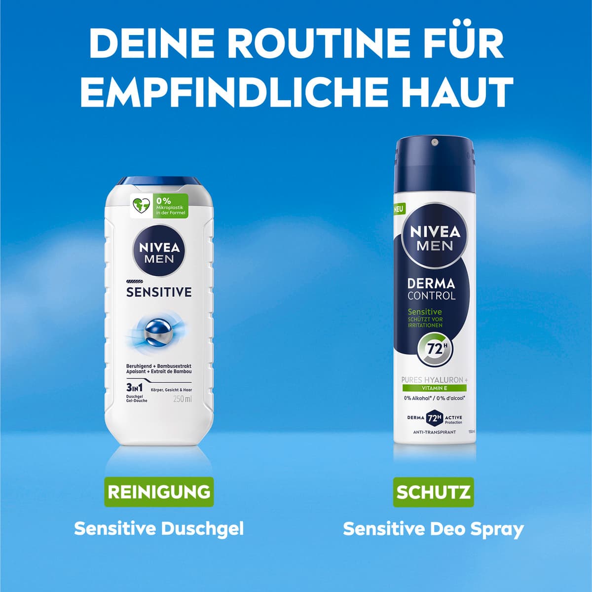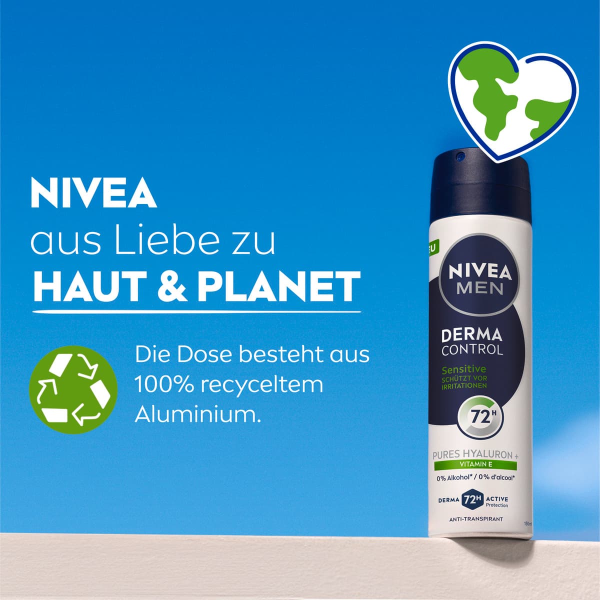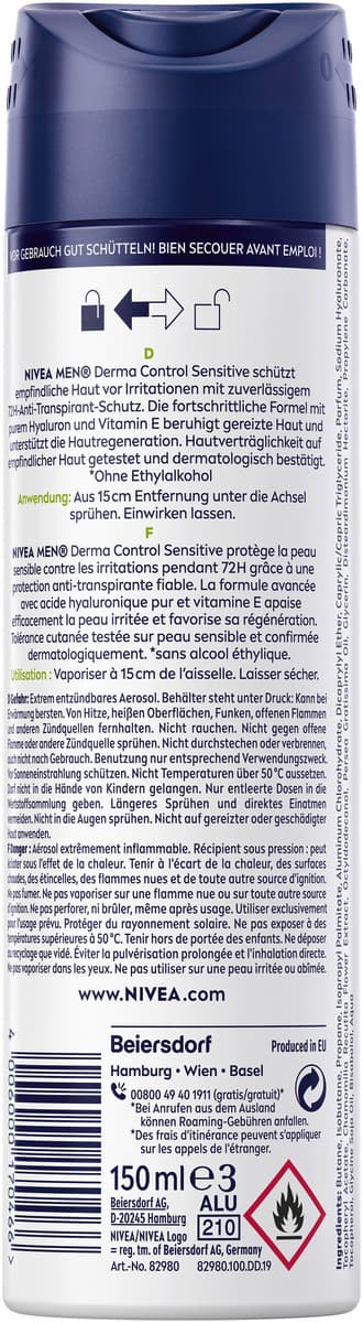 Das NIVEA MEN Derma Control Sensitive Anti-Transpirant bietet umfassenden Schutz vor Geruch, Schweiß, Brennen, Juckreiz und trockener Haut. Mit purem Hyaluron und Vitamin E beugt es Irritationen vor und bietet sanfte Pflege. Die Formel ist dermatologisch auf Hautverträglichkeit getestet und enthält keinen Ethylalkohol. Unsere Anti-Transpirantien bieten Derma 72 Stunden Aktiv-Schutz: Die Formel arbeitet mit der Haut zusammen, um eine zuverlässige und starke Wirkung gegen Schweiß und Geruch zu erzielen und gleichzeitig deine Achseln optimal zu pflegen. NIVEA ist in mehr als 160 Ländern präsent und gehört mit mehr als 140 Jahren Erfahrung zu den größten und vertrauenswürdigsten Hautpflegemarken der Welt. Als Marktführer in der globalen Hautpflegebranche arbeiten unsere Forscher intensiv daran, hochwertige, dermatologisch geprüfte Produkte für verschiedene Hauttypen und -bedürfnisse anzubieten.