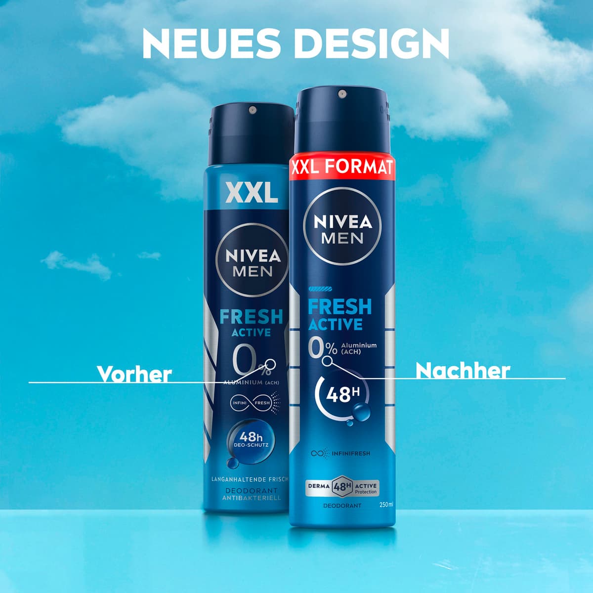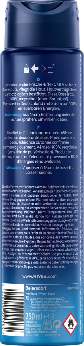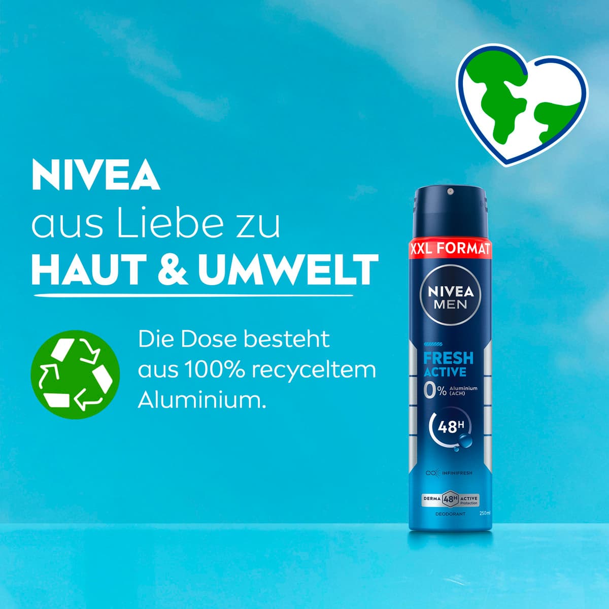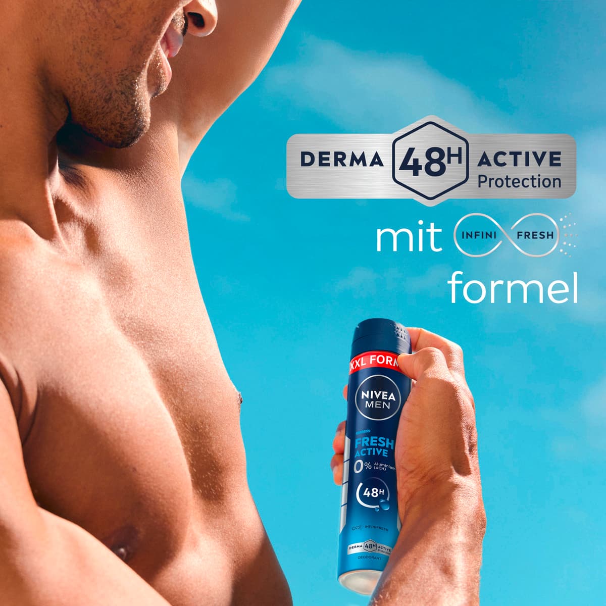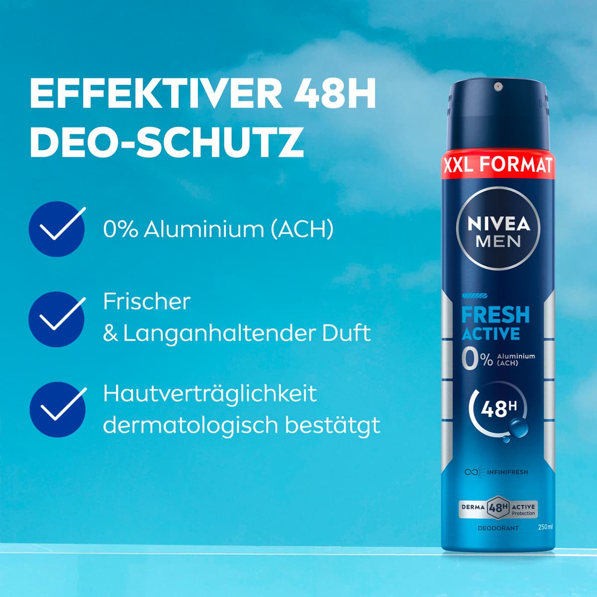 Das NIVEA MEN Fresh Active Spray im XXL-Format sorgt den ganzen Tag lang für ein frisches Gefühl dank effektivem und zuverlässigem Deo-Schutz vor Schweiß und Körpergeruch. Die einzigartige INFINIFRESH Formel mit 0% Aluminium (ACH) und Meeresextrakten verleiht ein langanhaltend sauberes und frisches Hautgefühl. Dabei wird die Haut unter den Achseln gepflegt. Unsere dermatologisch auf Hautverträglichkeit geprüften Deodorants bieten Derma 48h Aktiv-Schutz: Sie arbeiten mit der Haut zusammen und schützen zuverlässig und effektiv vor Schweiß und Geruch. NIVEA ist in über 160 Ländern präsent und gehört mit mehr als 140 Jahren Erfahrung zu den größten und vertrauenswürdigsten Hautpflegemarken der Welt. Als Marktführer in der globalen Hautpflegebranche arbeiten unsere Forscher intensiv daran, hochwertige, dermatologisch geprüfte Produkte für verschiedene Hauttypen und -bedürfnisse anzubieten.