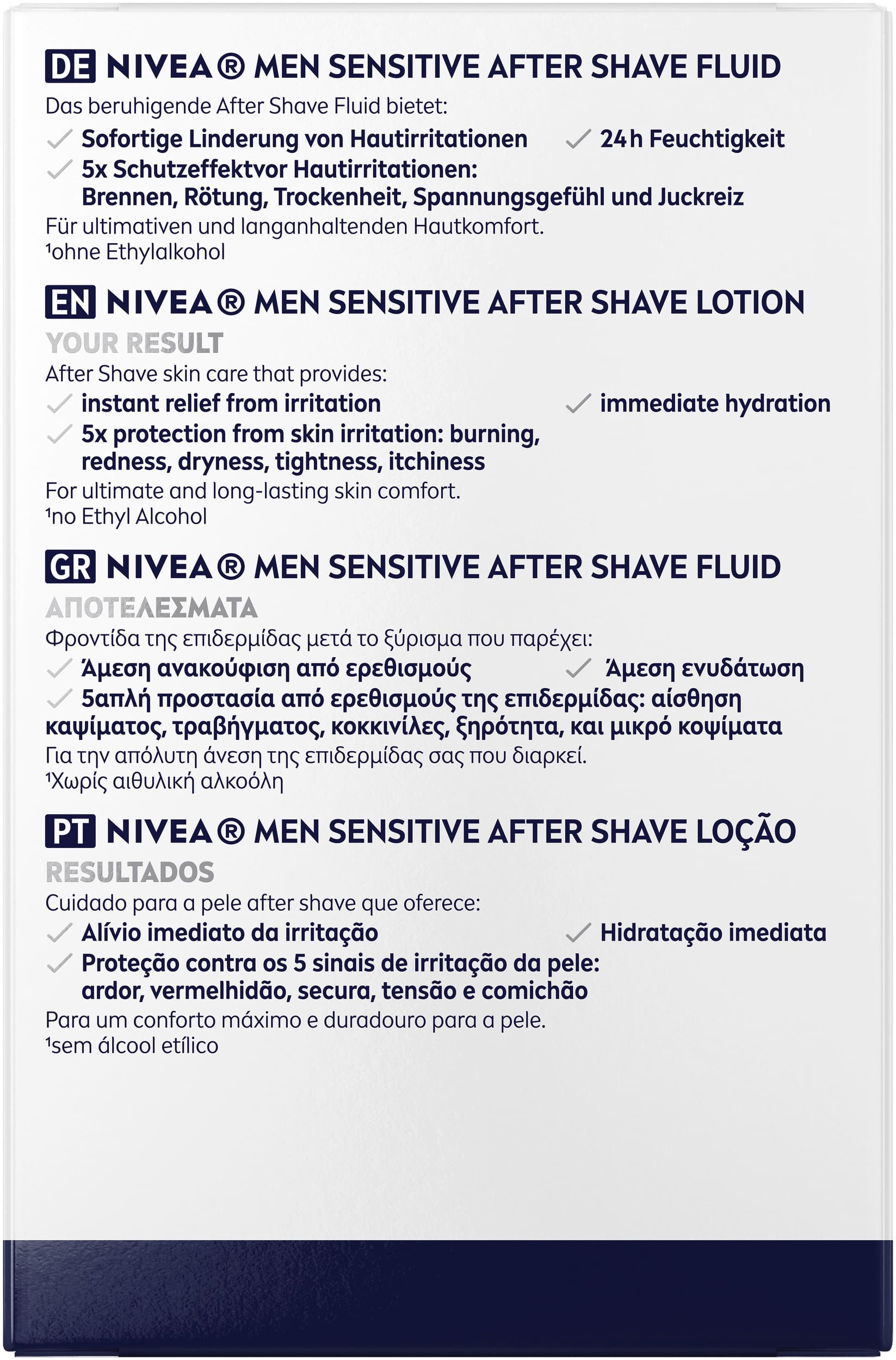 Das NIVEA MEN Sensitive After Shave Fluid wurde speziell für empfindliche Männerhaut entwickelt und bietet sofortige Beruhigung nach der Rasur. Hautrötungen, Brennen und Trockenheit werden dank der sanften Formel mit Vitamin E, Provitamin B5 und Kamillen-Extrakt deutlich reduziert. Die alkoholfreie Rezeptur brennt nicht und reizt die Haut nicht. Stattdessen sorgt das leichte Fluid für ein angenehmes, geschmeidiges Hautgefühl und eine gepflegte Optik. Direkt nach der Rasur aufgetragen, spendet es intensive Feuchtigkeit und schützt die Haut vor Irritationen. Das Ergebnis ist ein entspanntes Hautgefühl und ein frischer, gepflegter Look – Tag für Tag. NIVEA MEN Sensitive After Shave Fluid: Sanfte Pflege für sensible