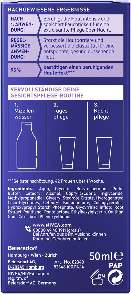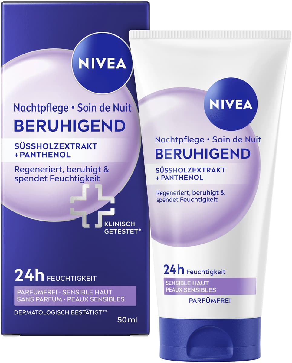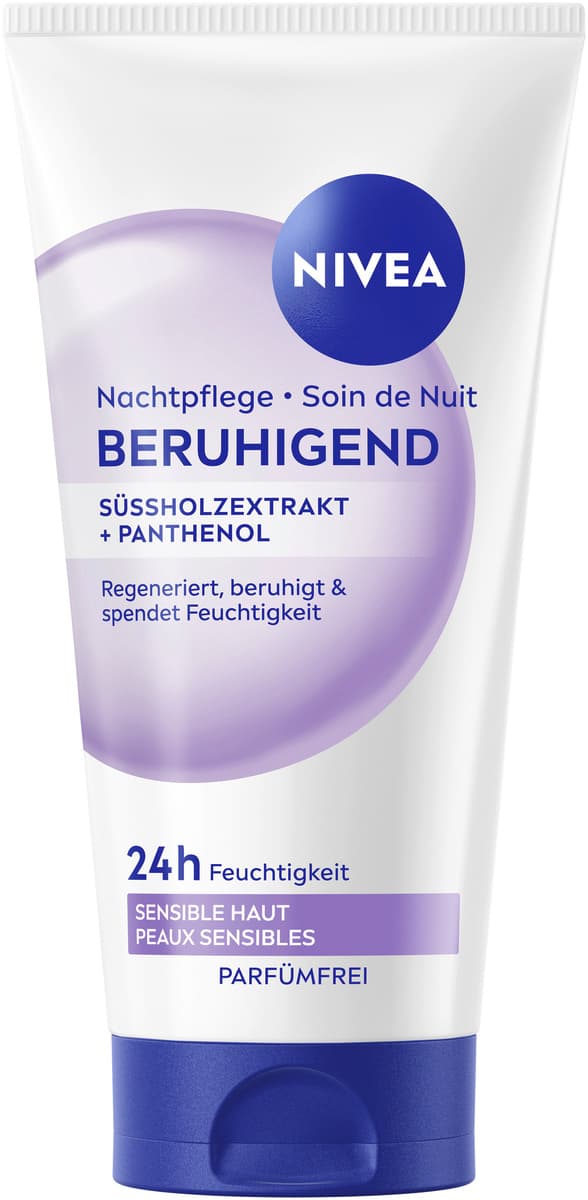 Die NIVEA Beruhigende Nachtcreme versorgt die Haut 24 Stunden lang mit wohltuender Feuchtigkeit und gleicht so den Feuchtigkeitshaushalt der Haut optimal aus. Die Creme mit wertvollem Süßholzextrakt und Panthenol mindert wirksam die drei Hauptsymptome empfindlicher Haut: Rötungen, Trockenheit und unangenehme Spannungsgefühle. Darüber hinaus unterstützt sie die natürliche Widerstandsfähigkeit der Haut gegen äußere Reizungen und fördert die natürliche Regeneration der Haut über Nacht. Die Nachtpflege ist komplett frei von Parfüm und die Hautverträglichkeit ist dermatologisch bestätigt. NIVEA ist in über 160 Ländern präsent und gehört mit mehr als 140 Jahren Erfahrung zu den größten und vertrauenswürdigsten Hautpflegemarken der Welt. Als Marktführer in der globalen Hautpflegebranche arbeiten unsere Forscher intensiv daran, hochwertig und dermatologisch geprüfte Produkte für verschiedene Hauttypen und -bedürfnisse anzubieten.