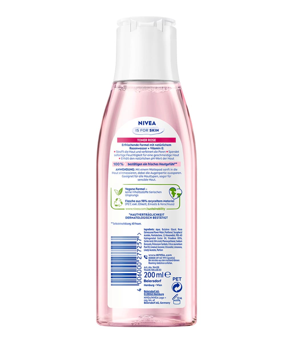 Der NIVEA Rose Care Erfrischende Toner mit konzentriertem natürlichem Rosenwasser und Vitamin E spendet sofort Feuchtigkeit, strafft die Haut und verfeinert die Poren. Die Formel sorgt für ein frisches Hautgefühl und ein glattes Hautbild direkt nach der Anwendung. Sie erhält den natürlichen pH-Wert der Haut. Der Toner wird einfach mit einem Wattepad sanft in die Haut einmassiert – dabei die empfindliche Augenpartie aussparen. Geeignet für alle Hauttypen, auch für sensible Haut. Die Hautverträglichkeit ist dermatologisch bestätigt. NIVEA ist in über 160 Ländern präsent und gehört mit über 140 Jahren Erfahrung zu den größten und vertrauenswürdigsten Hautpflegemarken weltweit. Unsere Forscher entwickeln hochwertige, dermatologisch geprüfte Pflegeprodukte für unterschiedliche Hauttypen und Bedürfnisse – mit dem Ziel, effektive Hautpflege für jeden Menschen weltweit dauerhaft zugänglich zu machen.