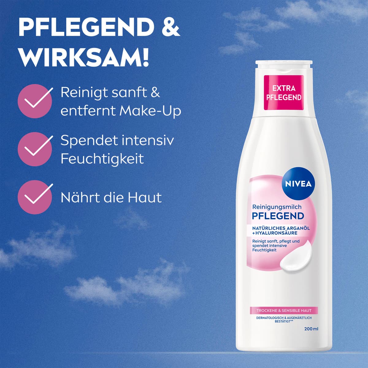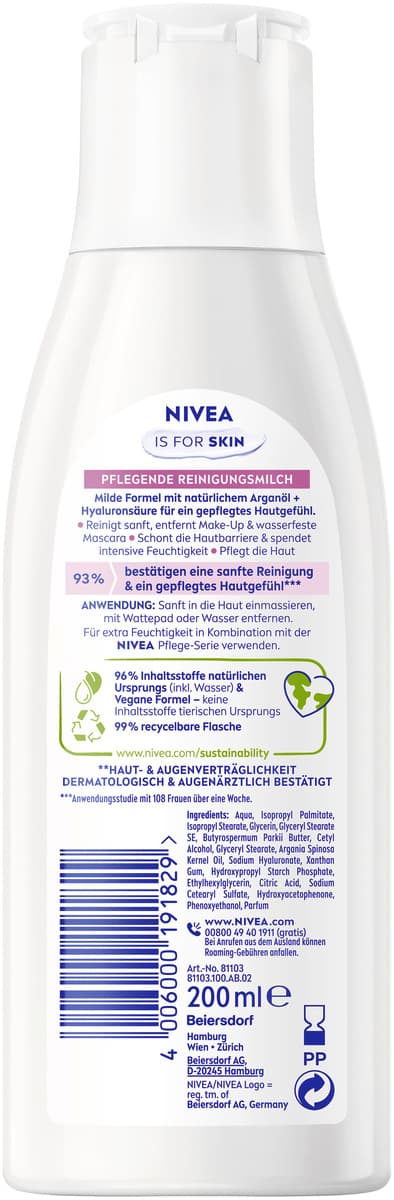 Die NIVEA Pflegende Reinigungsmilch ist angereichert mit Arganöl und Hyaluronsäure, um Feuchtigkeit effektiv in der Haut zu binden. Speziell entwickelt für trockene und sensible Haut, reinigt sie sanft und entfernt sogar wasserfestes Make-Up. Gleichzeitig spendet die Pflegende Reinigungsmilch intensive Feuchtigkeit, beruhigt und pflegt die Haut.
