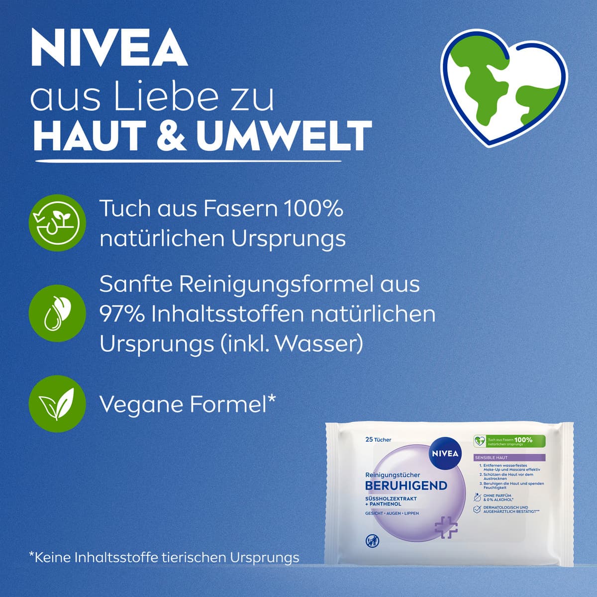 Die Beruhigenden Reinigungstücher von NIVEA wurden speziell entwickelt, um die Haut effektiv zu reinigen und gleichzeitig besonders sanft zu pflegen. Sie entfernen zuverlässig wasserfestes Make-up, Mascara und Unreinheiten – ganz ohne Reiben. Die extra-sanfte Formel mit Süßholzextrakt und Panthenol beruhigt die Haut und hilft, Irritationen zu vermeiden. Die Tücher bestehen aus 100 % natürlichen Fasern und sind daher auch für empfindliche Haut bestens geeignet. Ideal für die tägliche Anwendung oder für unterwegs – wenn es schnell gehen muss, aber die Pflege nicht zu kurz kommen soll. Ihre Haut fühlt sich nach der Reinigung frisch, weich und gepflegt an. Für ein gesundes Hautbild und ein angenehmes Gefühl: NIVEA Reinigungstücher Beruhigend, 25 Stück.
