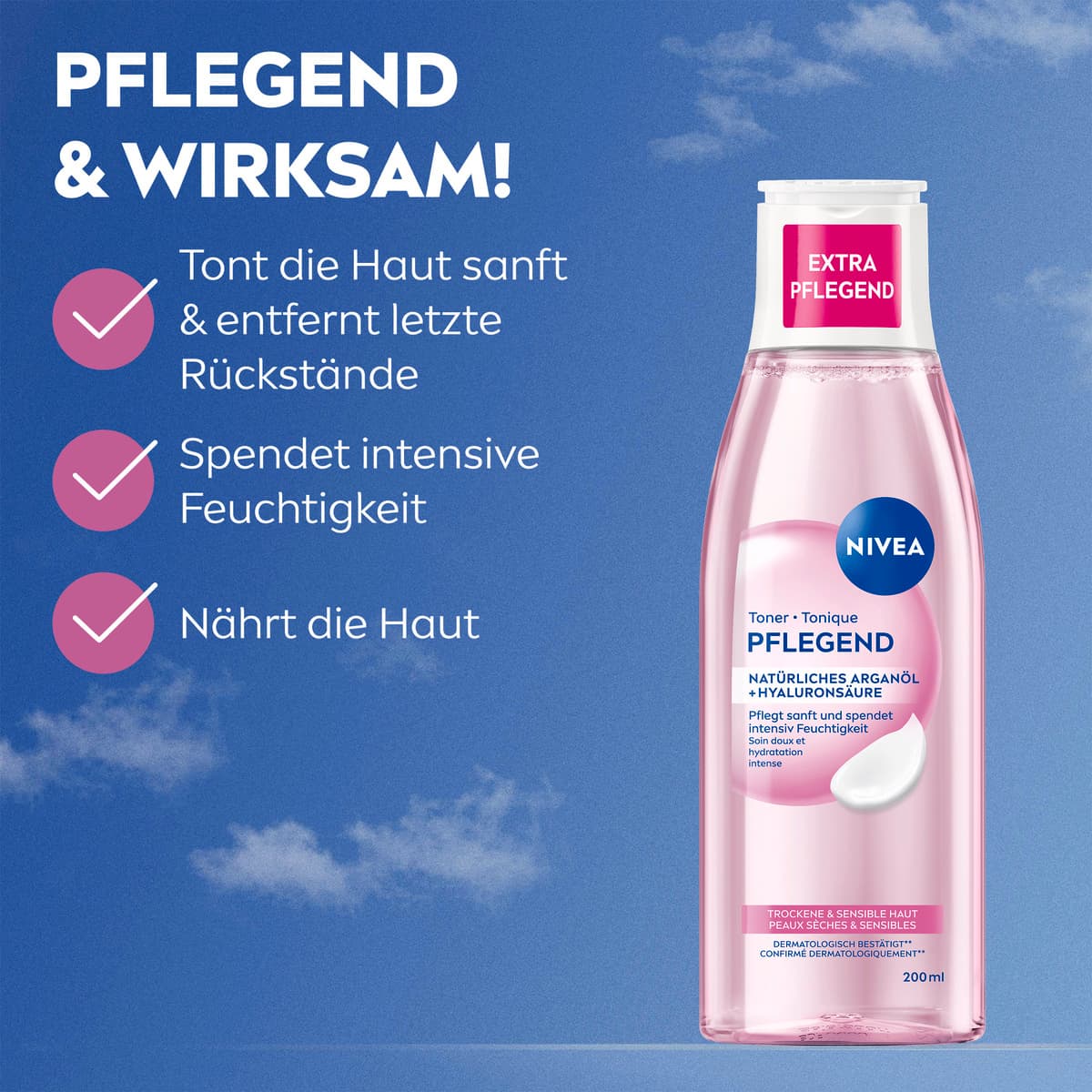 Halten Sie Ihre Haut weich, geschmeidig und gesund mit dem NIVEA Pflegenden Toner. Dieser Toner reinigt die Haut sanft von Schmutz und Unreinheiten und entfernt zudem letzte Make-Up Rückstände. Anders als andere Toner spendet die pflegende Formel Feuchtigkeit und beruhigt die Haut, ohne sie auszutrocknen – ideal für die tägliche Anwendung. Angereichert mit natürlichen Inhaltsstoffen ist dieser Toner für alle Hauttypen geeignet und hinterlässt ein frisches, vitalisiertes Hautgefühl. Probieren Sie es aus und erleben Sie die sanfte Kraft des NIVEA Pflegenden Toners.