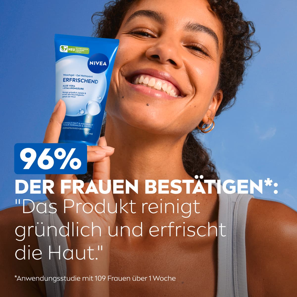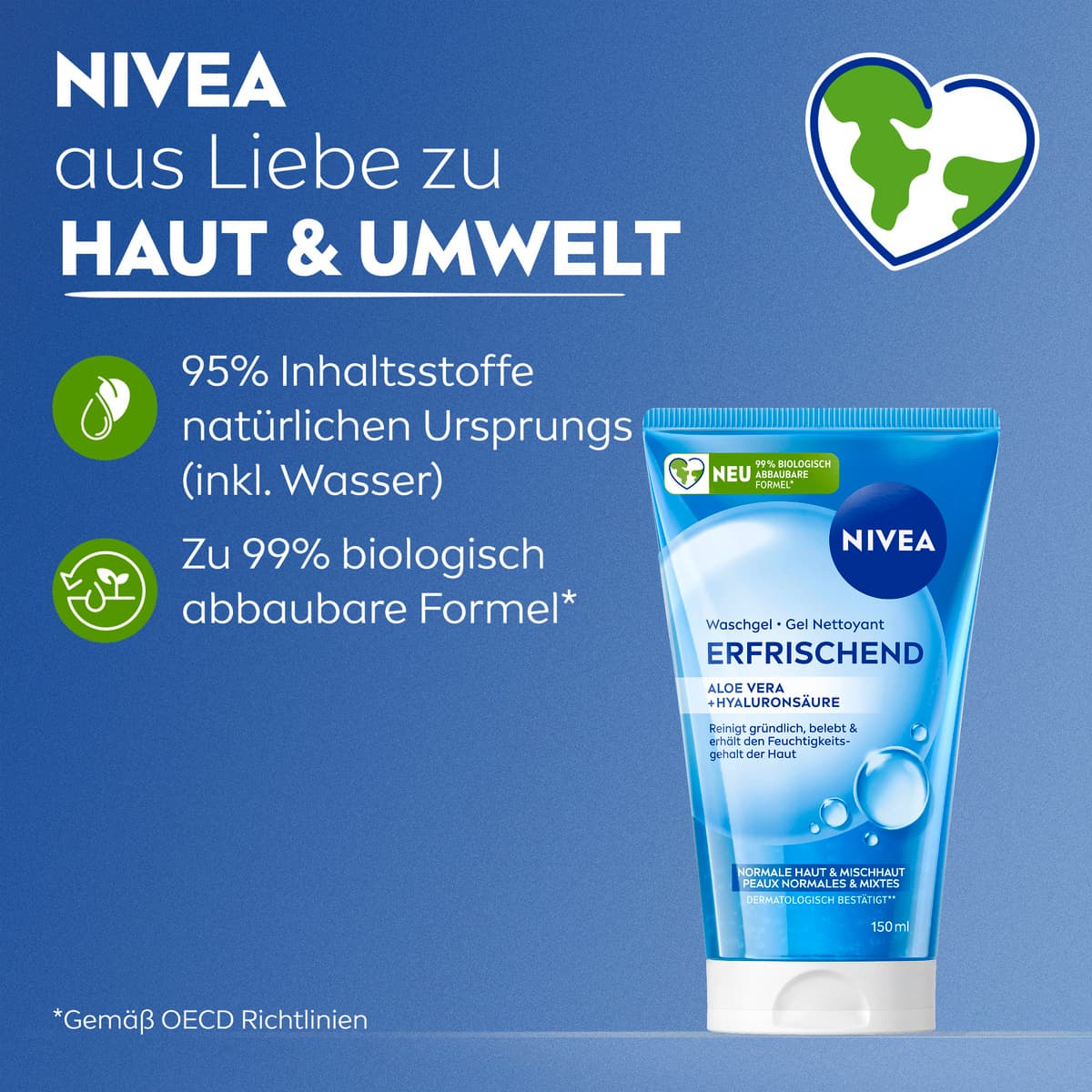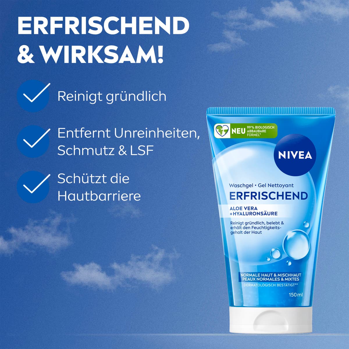 Das NIVEA Erfrischende Waschgel ist mit Aloe Vera und Hyaluronsäure angereichert, um effektiv Feuchtigkeit in der Haut zu binden. Speziell entwickelt für normale Haut und Mischhaut, reinigt es nicht nur gründlich und entfernt Unreinheiten, sondern belebt und erfrischt die Haut. Gleichzeitig pflegt es und erhält den natürlichen Feuchtigkeitsgehalt. ERGEBNIS: Die Haut ist gründlich gereinigt und erfrischt, wirkt gesund und schön. Hautverträglichkeit dermatologisch bestätigt.**