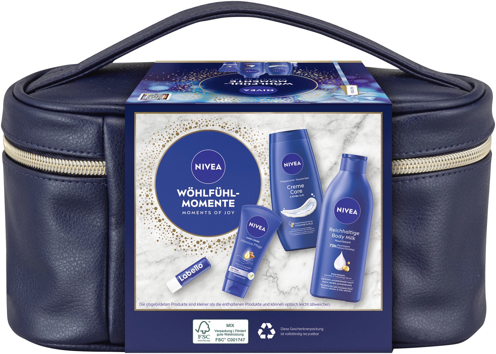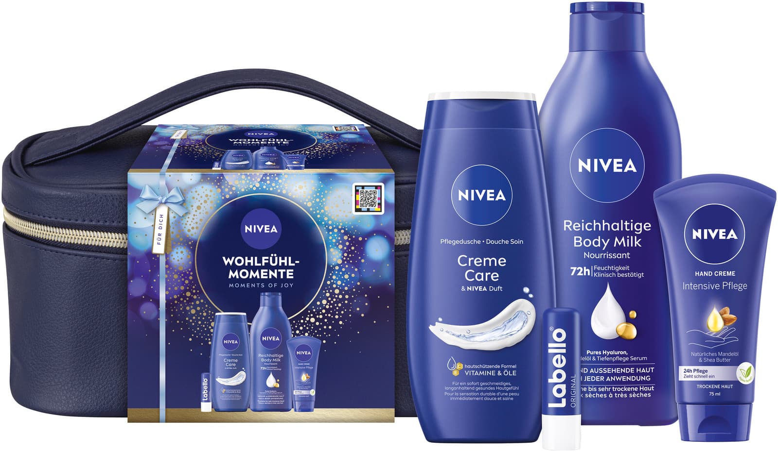 Freude verschenken mit dem NIVEA Wohlfühl-Momente Geschenkset: Die NIVEA Hand Creme verwöhnt mit ihrer intensiven Pflege und dem beliebten Duft und ist dabei für jeden Hauttyp geeignet. Für zarte und gepflegte Haut sowie 72h Feuchtigkeit sorgt die NIVEA Reichhaltige Body Milk mit purem Hyaluron, Mandelöl und Tiefenpflege Serum. Mit der reichhaltigen Formel wird trockene bis sehr trockene Haut intensiv gepflegt. Die NIVEA Creme Care Pflegedusche mit den Vitaminen C & E und wertvollen Ölen reinigt und verwöhnt mit samtweichem Schaum sowie dem vertrauten NIVEA Duft die Haut unter der Dusche. Der Labello Original ergänzt das Set ideal: Seine hochwirksame Formel mit Sheabutter und natürlichen Ölen pflegt die Lippen und schützt sie vor dem Austrocknen.