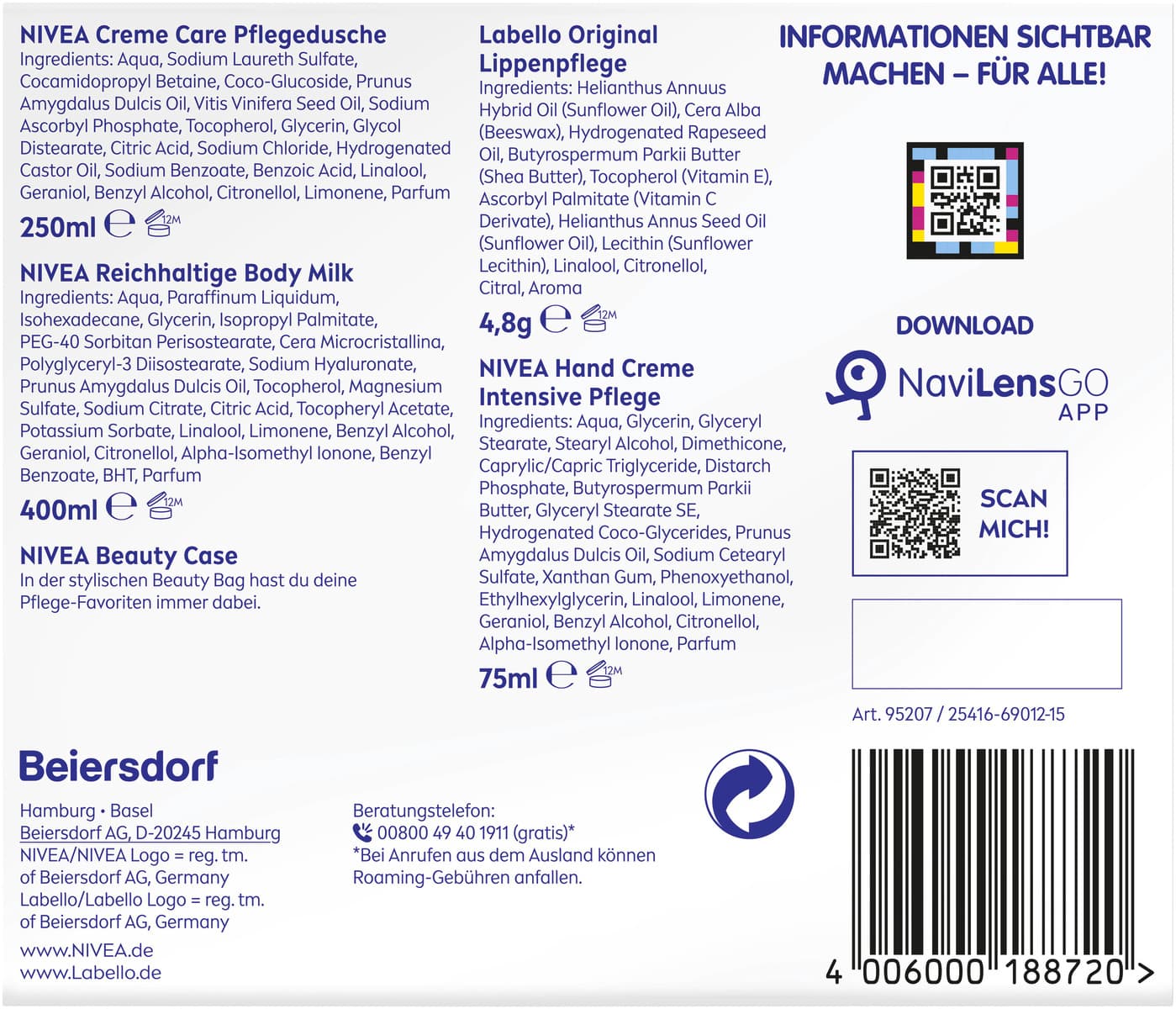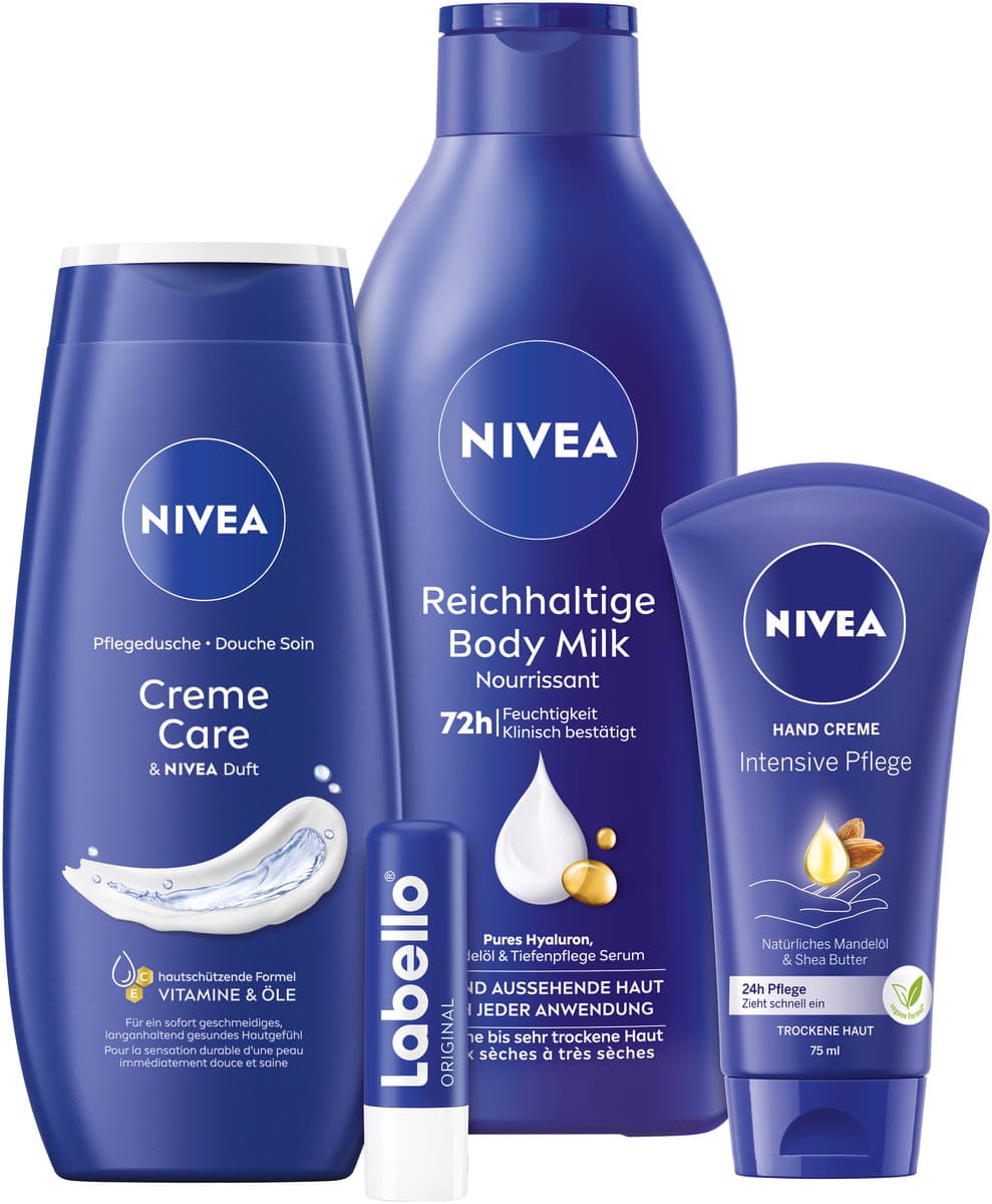 InhaltsstoffeNIVEA Hand Creme Intensive Pflege Ingredients: Aqua, Glycerin, Glyceryl Stearate, Stearyl Alcohol, Dimethicone, Caprylic/Capric Triglyceride, Distarch Phosphate, Butyrospermum Parkii Butter, Glyceryl Stearate SE, Hydrogenated Coco-Glycerides, Prunus Amygdalus Dulcis Oil, Sodium Cetearyl Sulfate, Xanthan Gum, Phenoxyethanol, Ethylhexylglycerin, Linalool, Limonene, Geraniol, Benzyl Alcohol, Citronellol, Alpha-Isomethyl Ionone, Parfum NIVEA Creme Care Pflegedusche Ingredients: Aqua, Sodium Laureth Sulfate, Cocamidopropyl Betaine, Coco-Glucoside, Prunus Amygdalus Dulcis Oil, Vitis Vinifera Seed Oil, Sodium Ascorbyl Phosphate, Tocopherol, Glycerin, Glycol Distearate, Citric Acid, Sodium Chloride, Hydrogenated Castor Oil, Sodium Benzoate, Benzoic Acid, Linalool, Geraniol, Benzyl Alcohol, Citronellol, Limonene, Parfum NIVEA Reichhaltige Body Milk Ingredients: Aqua, Paraffinum Liquidum, Isohexadecane, Glycerin, Isopropyl Palmitate, PEG-40 Sorbitan Perisostearate, Cera Microcristallina, Polyglyceryl-3 Diisostearate, Sodium Hyaluronate, Prunus Amygdalus Dulcis Oil, Tocopherol, Magnesium Sulfate, Sodium Citrate, Citric Acid, Tocopheryl Acetate, Potassium Sorbate, Linalool, Limonene, Benzyl Alcohol, Geraniol, Citronellol, Alpha-Isomethyl Ionone, Benzyl Benzoate, BHT, Parfum Labello Original Lippenpflege Ingredients: Helianthus Annuus Hybrid Oil (Sunflower Oil), Cera Alba (Beeswax), Hydrogenated Rapeseed Oil, Butyrospermum Parkii Butter (Shea Butter), Tocopherol (Vitamin E), Ascorbyl Palmitate (Vitamin C Derivate), Helianthus Annuus Seed Oil (Sunflower Oil), Lecithin (Sunflower Lecithin), Linalool, Citronellol, Citral, Aroma