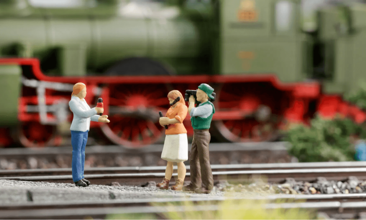 Bringen Sie Leben und Dynamik in Ihre Modelllandschaft mit dem Funny-Scenes „Reporter Team“ von NOCH! Dieses detailverliebte Figurenset im Maßstab H0 (1:87) zeigt ein professionelles Reporter-Team bei der Arbeit: Die Reporterin spricht engagiert ins Mikrofon, der Kameramann filmt konzentriert die Szene, und eine dritte Person – vermutlich die Redakteurin – macht sich Notizen.
