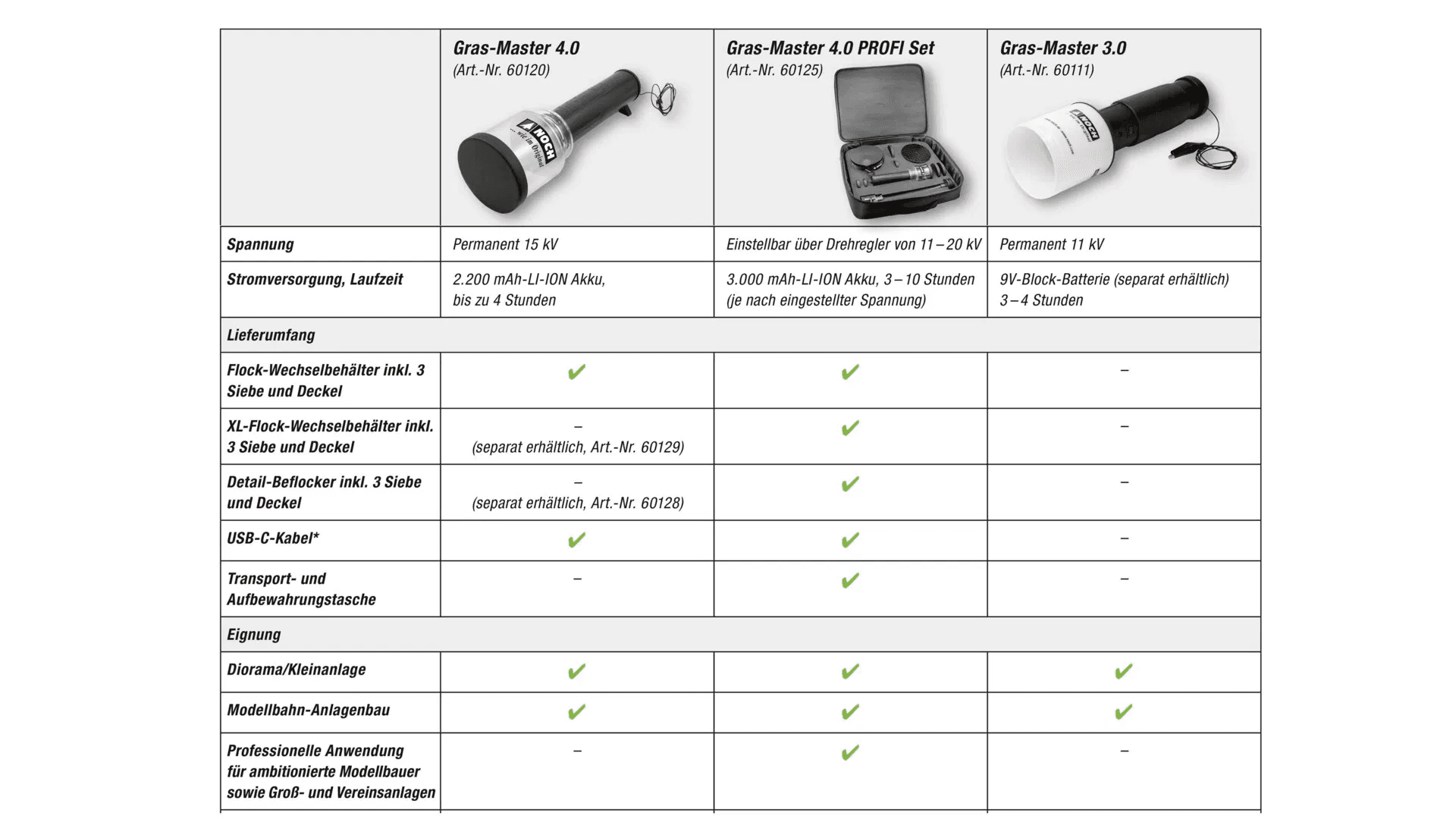 Lieferumfang: Gras-Master 4.0 PROFI, Standard- und XL-Flock-Wechselbehälter, Detail-Beflocker, Siebe, Deckel, Transport-Tasche, USB-C-Kabel