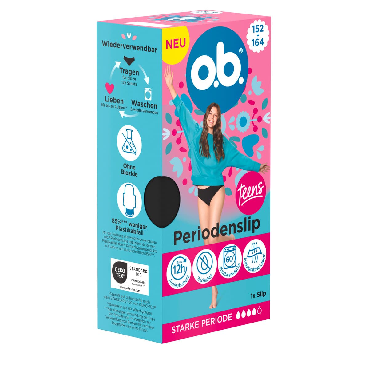 Teen’s Periodenslips von o.b.® sind speziell für Teens entwickelt. Die extra große Saugeinlage bietet zuverlässigen Auslaufschutz bis zu 12 Stunden und ein sicheres Gefühl, während der Slip sich bequem anpasst und sich wie die die normale Unterwäsche anfühlt. Für einen sorgenfreien Schultag. Wiederverwendbar für bis zu 4 Jahre** ** Basierend auf 60 Waschgängen.