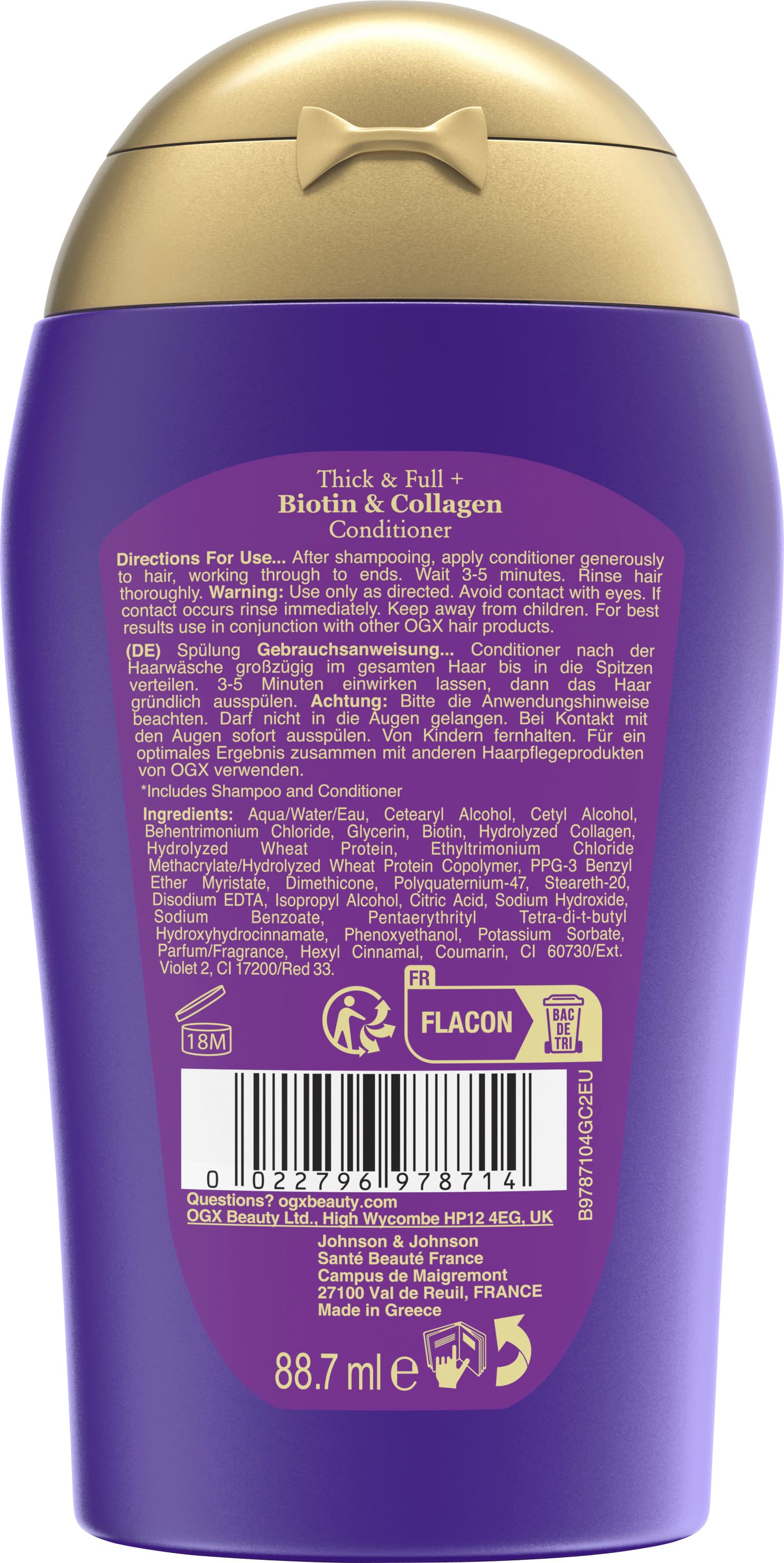 - Nährstoffreiche&super Volumen gebende Formel – Der OGX Thick&Full + Biotin&Collagen Conditioner mit innovativem Vitamin B7 Biotin, wertvollem Kollagen und natürlichem Weizenprotein ist ein Must-have für feines Haar.