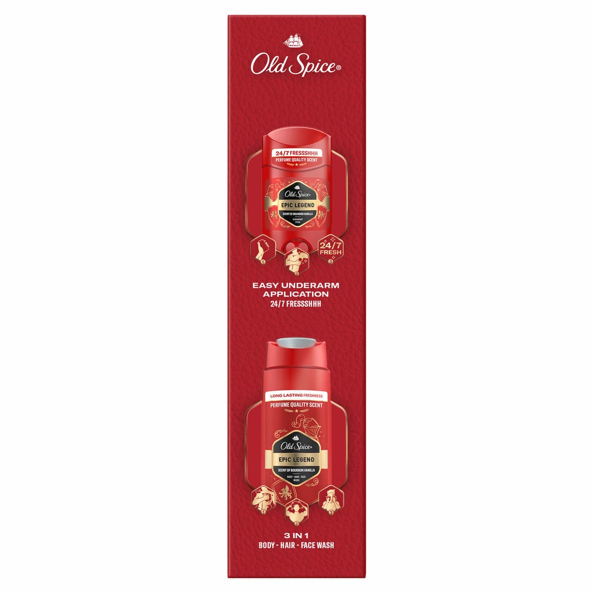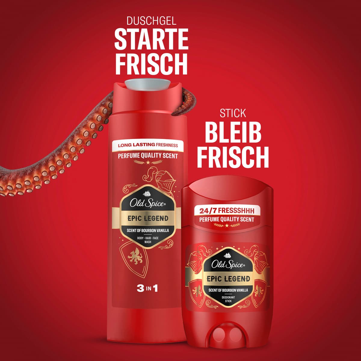 Erlebe unglaubliche Frische 24/7* mit den Old Spice Geschenksets! Auf der Suche nach dem perfekten Geschenk für den Fantasy-Liebhaber, der sich furchtlos und mit einem unverkennbaren Duft auf Abenteuer begibt? Hier wirst du fündig! Das Geschenkset enthält den Epic Legend Deostick und das passende Duschgel für Männer – stilvoll verpackt in einer Kartonschachtel im Knight-Design. Der hochwertige Duft von Old Spice Epic Legend ist immer eine gute Wahl: Der Duft von Bourbon-Vanille, Kirschtabak, geräuchertem Eichenholz und warmem Amber verwandelt dich in einen legendären Ritter der Frische. Warum ist dieses Old Spice Geschenkset noch nicht in deinem Warenkorb? (*bei Verwendung von Duschgel und Deostick)
