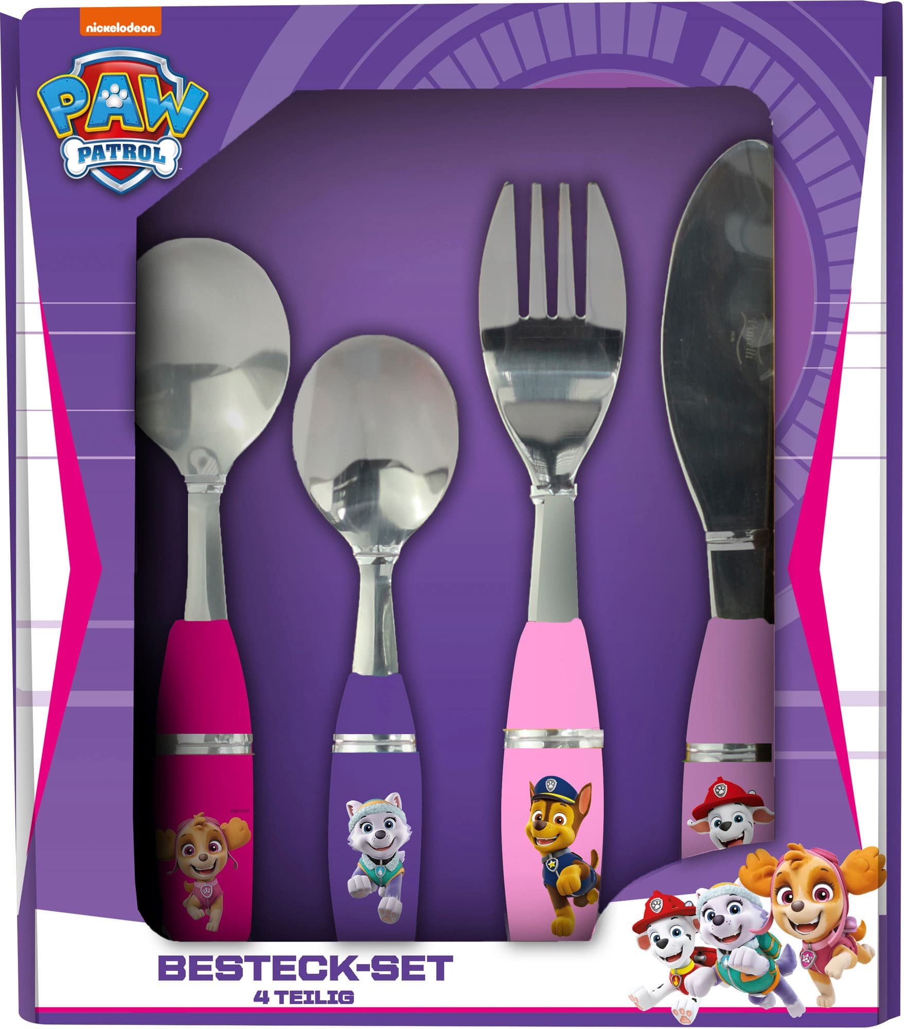 4-teiliges Besteckset für Mädchen ab 3 Jahren. Griffe in 4 verschiedenen Farben. Fördert Kleinkinder beim Erlernen des Umgangs mit Besteck, motiviert zum eigenständigen Essen Inhalt: Gabel, Messer, großer Löffel und Tee-Löffel