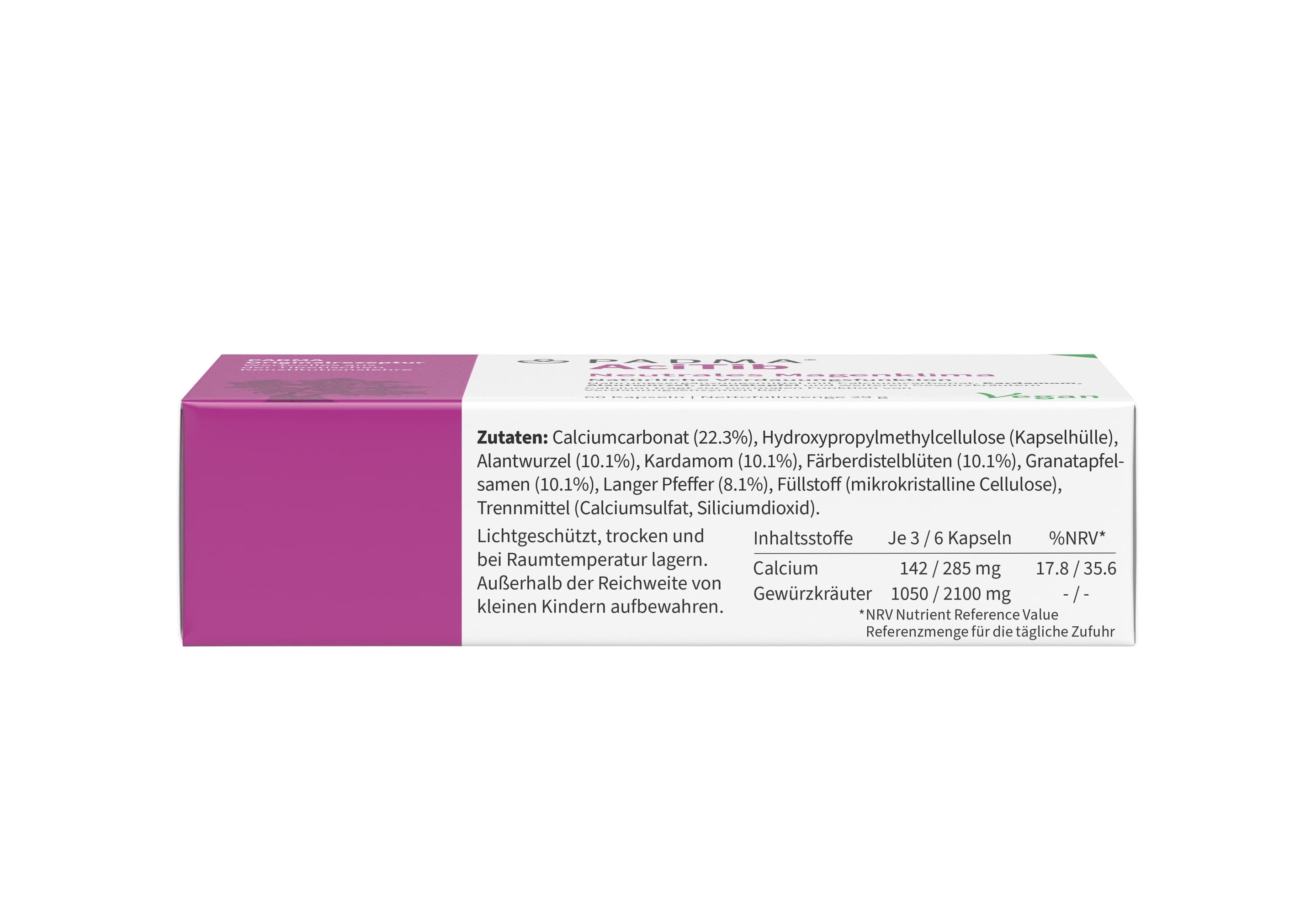 ZutatenCalciumcarbonat (22.3%), Hydroxypropylmethylcellulose (Kapselhülle), Alantwurzel (10.1%), Kardamom (10.1%), Färberdistelblüten (10.1%), Granatapfelkerne (10.1%), Langer Pfeffer (8.1%), Füllstoff (mikrokristalline Cellulose), Trennmittel (Calciumsulfat, Siliciumdioxid).