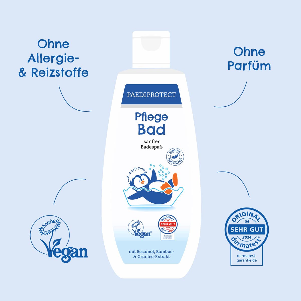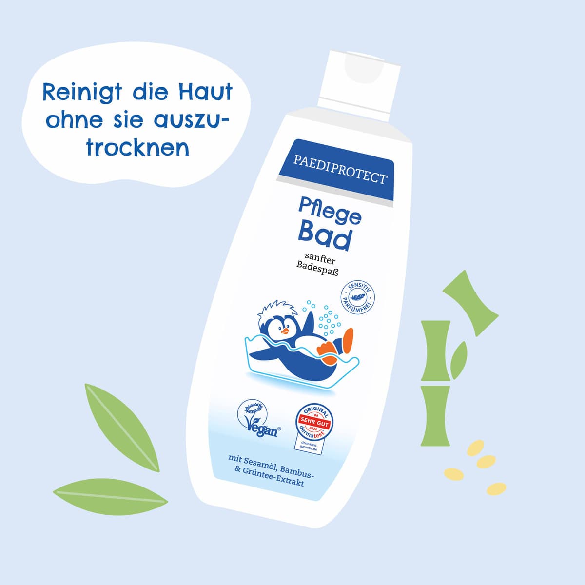 Das Pflegebad mit milden Waschsubstanzen auf pflanzlicher Basis bietet sanften Badespaß für Groß und Klein. Das Pflegebad ist ein besonders hautschonender und zart aufschäumender Badezusatz. Milde Waschsubstanzen auf pflanzlicher Basis reinigen und pflegen die Haut ohne sie auszutrocknen. Wertvolles Sesamöl macht die Haut geschmeidig, glättet sie und hält sie in einem guten Zustand. Die enthaltenen Extrakte aus Bambus und grünem Tee haben eine hautberuhigende, kräftigende Wirkung. Damit bietet das Pflegebad einen sanften Badespaß für Babys und Kinder, aber auch für Erwachsene mit sensibler, trockener oder zu Irritationen neigender Haut.