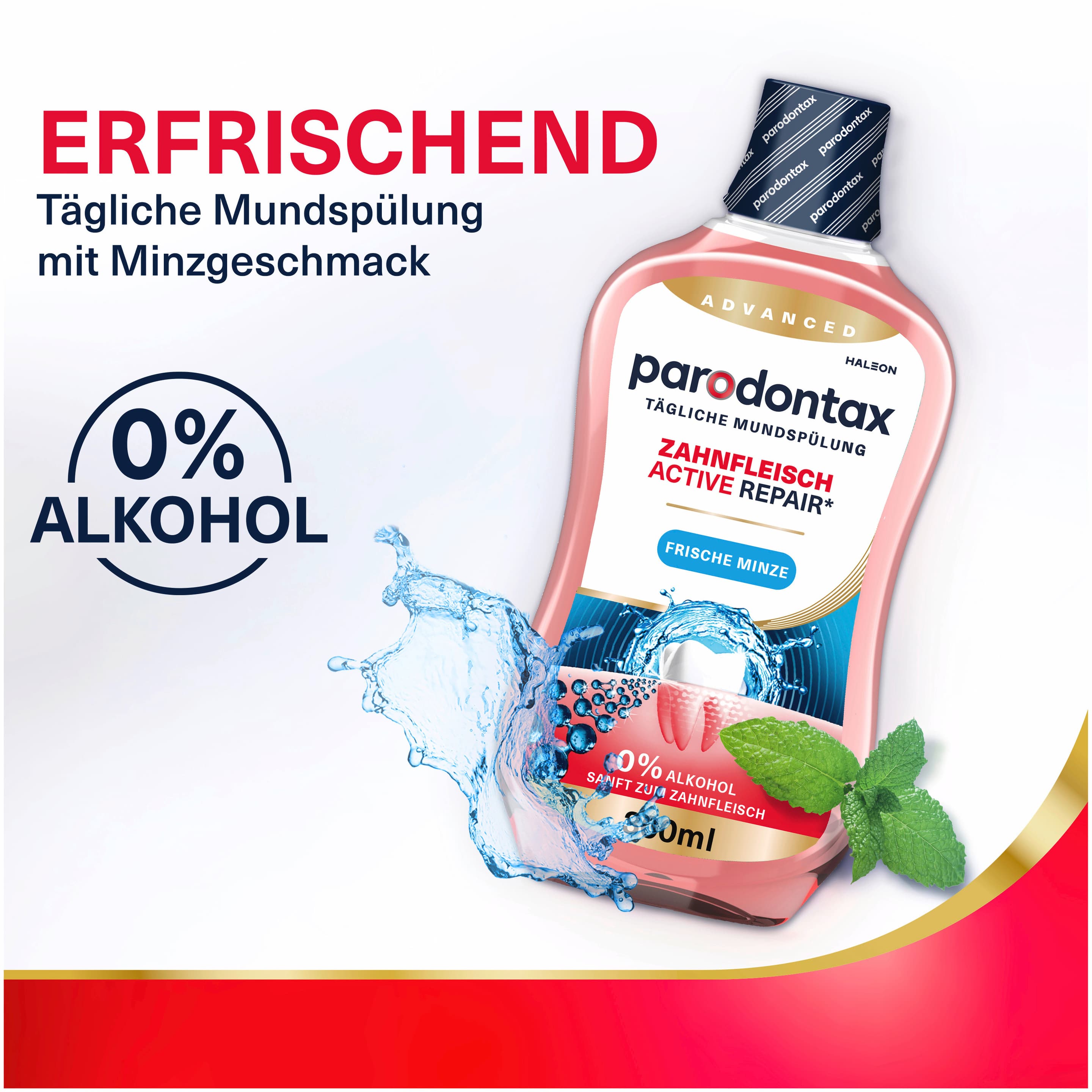 Die Parodontax Active Repair Mundspülung mit frischem Minzgeschmack ist eine tägliche Ergänzung zur Mundhygiene. Sie wurde für die Pflege des Zahnfleisches konzipiert und erreicht auch Stellen, die beim Zähneputzen schwer zugänglich sind.