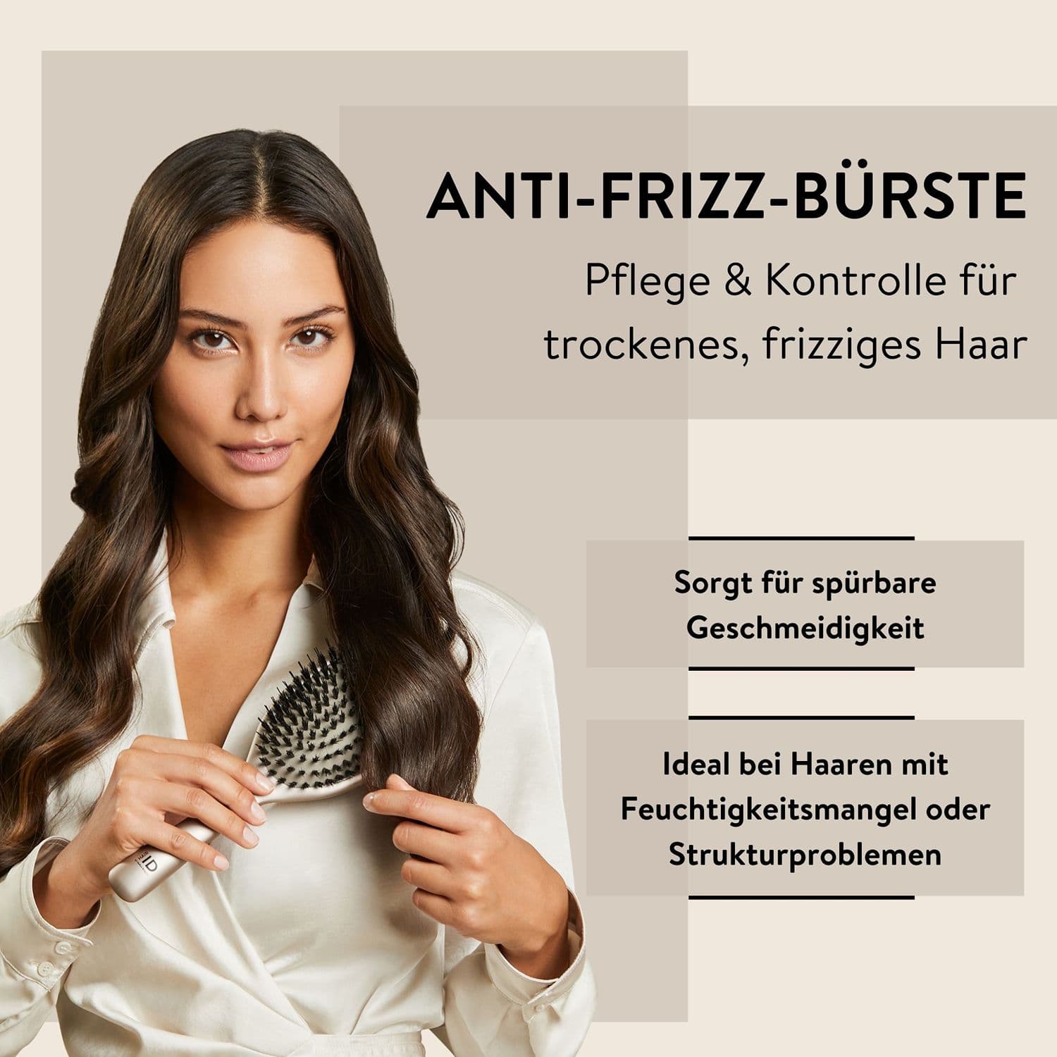 Die Paddle Brush aus der Hair ID Serie ist auf die Bedürfnisse von zu Frizz neigendem Haar abgestimmt. Die Kombination aus robusten Wildschweinborsten und flexiblen V-Pins gleitet mühelos durch das Haar, ohne zu ziepen. Während des Bürstens tragen die mit Collagen und Hyaluron angereicherten Naturborsten zu einem gepflegten Erscheinungsbild bei. Das Haar lässt sich nach der Anwendung leichter stylen und erhält eine glatte Struktur.