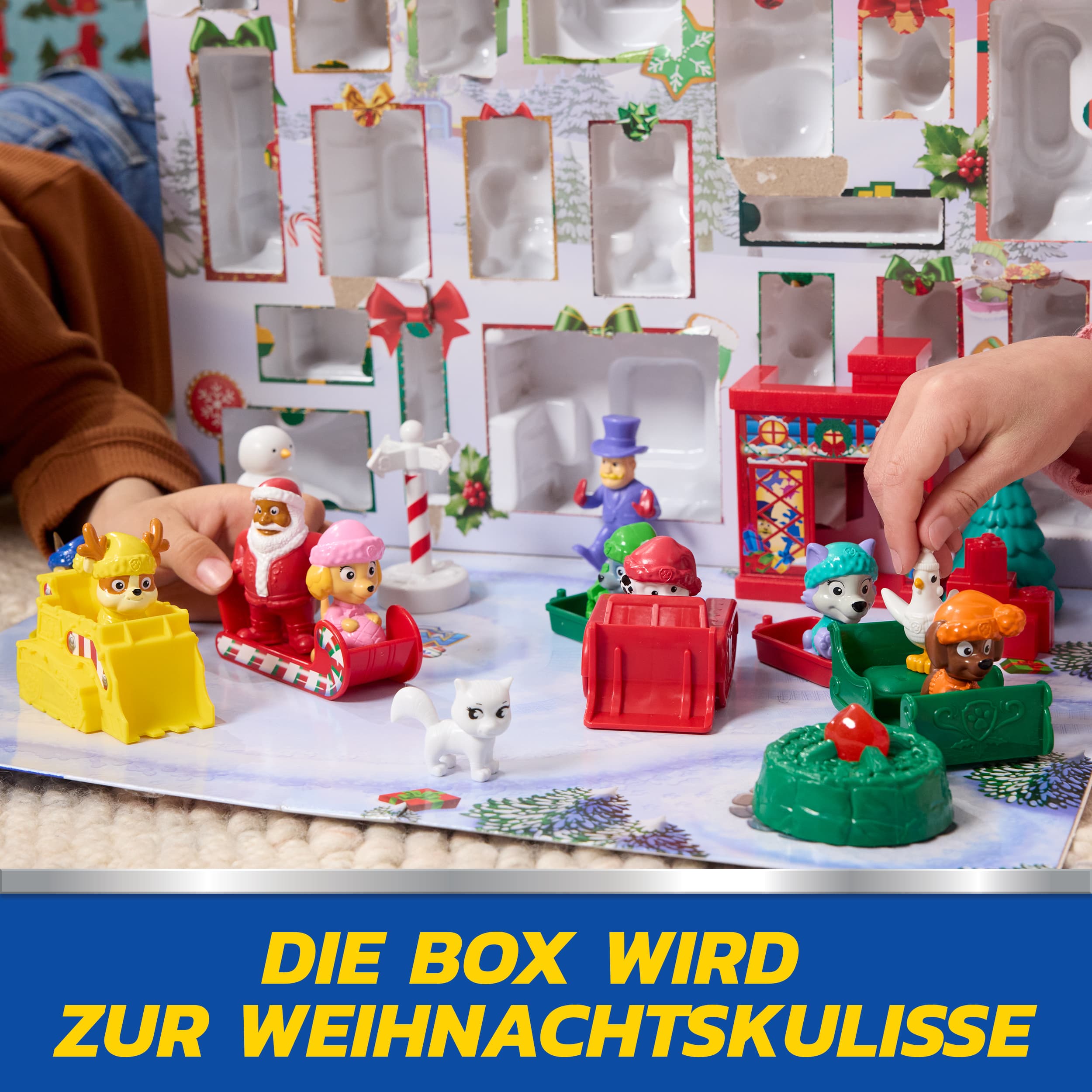 Mit dem spannenden Adventskalender von PAW Patrol lässt sich die Zeit bis Weihnachten ganz wunderbar vertreiben. Hinter jedem der 24 Türchen erwartet kleine PAW Patrol Fans eine tolle Überraschung: weihnachtliche Figuren und Fahrzeuge oder hochwertiges Spielzubehör aus Kunststoff, mit dem die Geschichten aus dem Episodenspecial zu Weihnachten zuhause nachgestellt werden können. Entdecken können Kinder zum Beispiel ihre Lieblingsfellfreunde Chase, Marshall, Skye, Rubble oder Rocky in zuckersüßen winterlichen Outfits oder auch einen Weihnachtsmann und Bürgermeister Besserwisser. Dieses Jahr als Special mit dabei: 7 weihnachtliche Fahrzeuge wie zum Beispiel Rubbles Bulldozer oder Santas Schlitten. Aber auch andere Tiere wie Huhn Henrietta oder eine Katze sowie winterliche Zubehörteile verstecken sich hinter den Türchen. Mit diesen Spielzeugen sind dem Erfinden eigener kreativer Weihnachtsgeschichten keine Grenzen gesetzt. Und natürlich lässt sich die Spielwelt mit anderen PAW Patrol Minifiguren und Accessoires (separat erhältlich) weiter ausbauen, denn von seinen Lieblingshelden bekommt man schließlich nie genug.