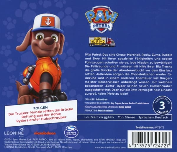 | 13 | | Greis, Julian | PAW Patrol: Die Trucker-Hunde retten die Brücke / Rettung aus der Höhle / Ryders erster Hubschrauber (CD 69) | 00:03:07 |