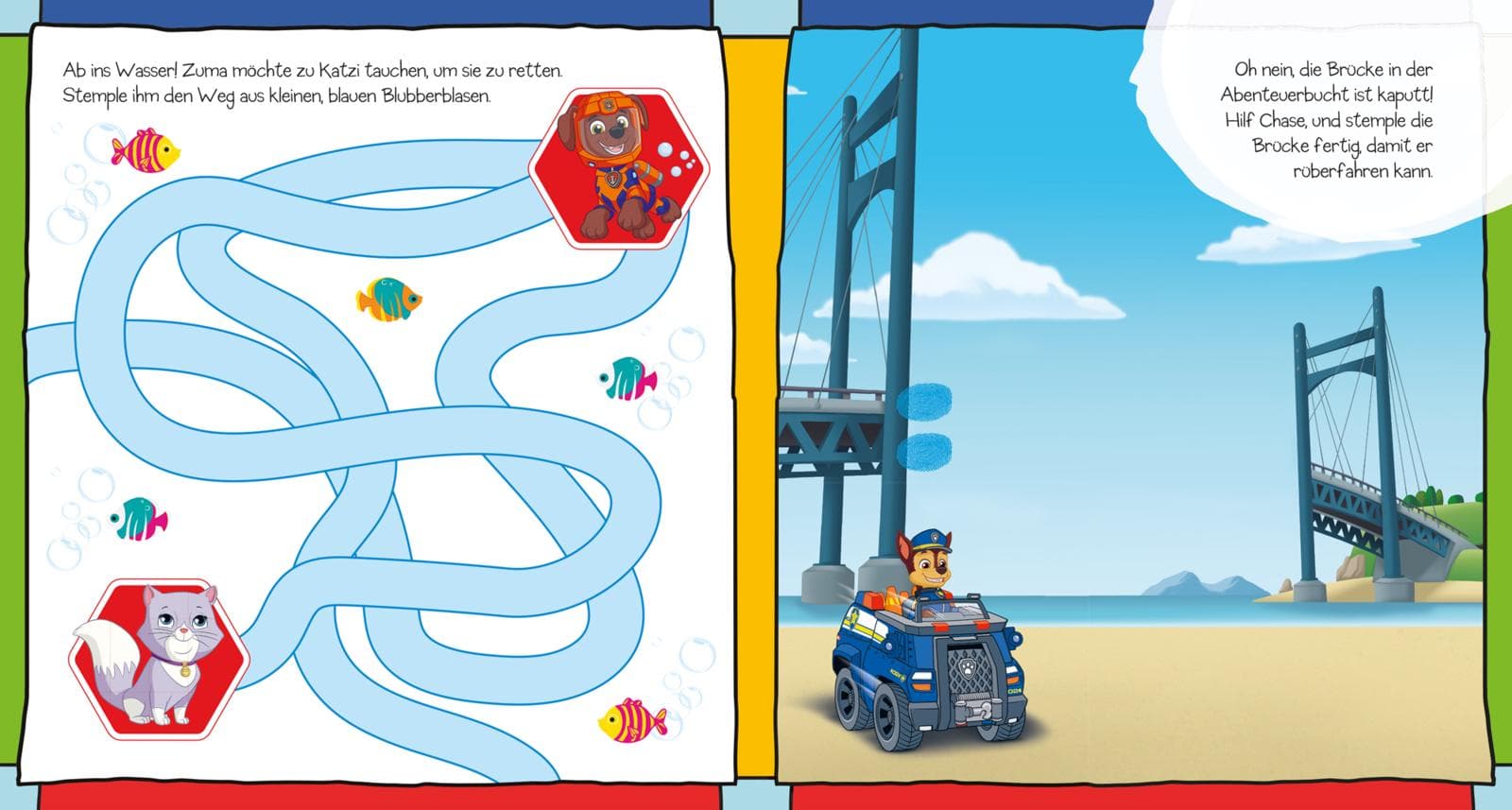 Ob ein selbstgemaltes PAW-Patrol-Abzeichen, der Bau einer Brücke mit Chase oder ein Ausflug zu Zumas Unterwasserfreunden – die kreativen Vorlagen in diesem Buch laden zum Stempeln und Weiterzeichnen ein. So können Kinder ab 3 Jahren spielerisch die Welt der PAW Patrol entdecken und eigene Kunstwerke gestalten.