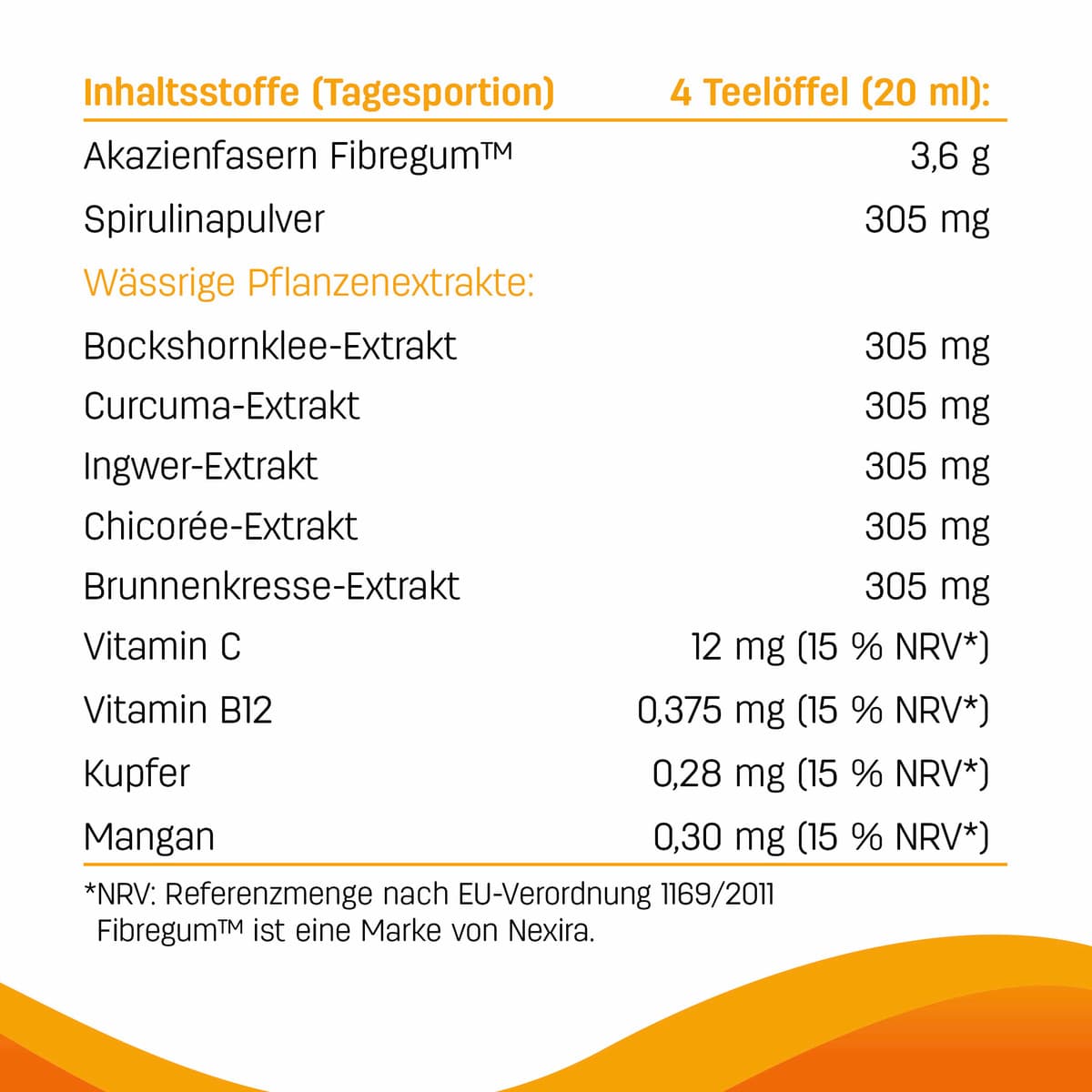 ZutatenAgavendicksaft 40%, gereinigtes Wasser, Akazienfasern Fibregum™ 15%, Mischung wässriger Pflanzenextrakte: Bockshornklee (Trigonella foenum-graecum, Samen), Curcuma (Curcuma longa, Rhizom), Ingwer (Zingiber officinale, Rhizom), Chicorée (Cichorium intybus, Wurzel), Brunnenkresse (Nasturtium officinale, oberirdische Teile); Spirulinapulver (Spirulina platensis), Zitronensaftkonzentrat, Vitamin C (L-Ascorbinsäure), Kupfersulfat, Mangansulfat, Vitamin B12 (Cyanocobalamin), Maltodextrin, natürliche Aromen, Himbeerpulver. Inhaltsstoffe (Tagesportion)/4 Teelöffel (20ml) Akazienfasern Fibregum™3,6 g Spirulinapulver 305 mg Wässrige Pflanzenextrakte: Bockshornklee-Extrakt 305 mg Curcuma-Extrakt 305 mg Ingwer-Extrakt 305 mg Chicorée-Extrakt 305 mg Brunnenkresse-Extrakt 305 mg