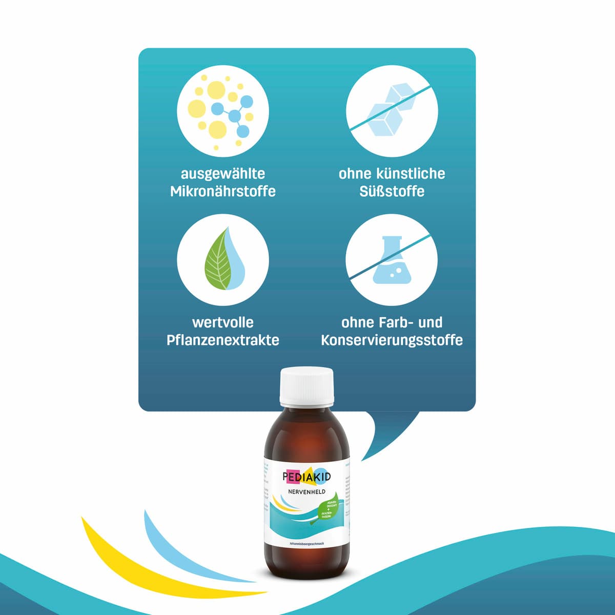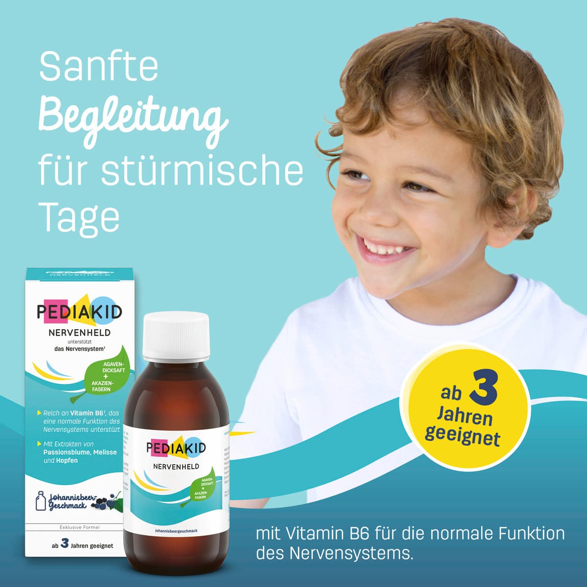 NERVENHELD – Die natürliche Unterstützung für das Nervensystem. Kinder sind in ihrem Alltag und ihrer Entwicklung besonders anfällig für Reizüberflutung, da ihr Nervensystem noch nicht vollständig ausgereift ist. Der Nervenheld wurde entwickelt, um ruhelose, gestresste oder überreizte Kinder zu unterstützen: Vitamin B6 trägt zur normalen Funktion des Nervensystems bei. Zusätzlich sind wertgebende Extrakte aus Melisse, Hopfen und Passionsblume enthalten.