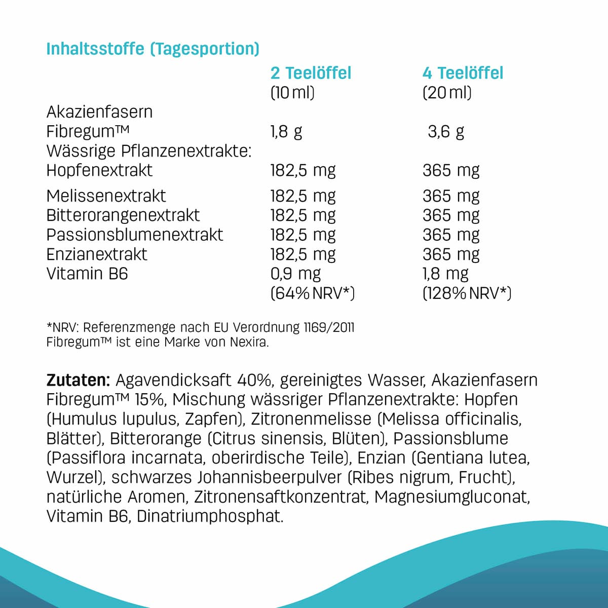 ZutatenAgavendicksaft 40%, gereinigtes Wasser, Akazienfasern Fibregum™ 15%, Mischung wässriger Pflanzenextrakte: Hopfen (Humulus lupulus, Zapfen), Zitronenmelisse (Melissa officinalis, Blätter), Bitterorange (Citrus sinensis, Blüten), Passionsblume (Passiflora incarnata, oberirdische Teile), Enzian (Gentiana lutea, Wurzel); schwarzes Johannisbeerpulver (Ribes nigrum, Frucht), natürliche Aromen, Zitronensaftkonzentrat, Magnesiumgluconat, Vitamin B6, Dinatriumphosphat. Akazienfasern Fibregum™ 1,8 g Wässrige Pflanzenextrakte: Hopfenextrakt 182,5 mg Melissenextrakt 182,5 mg Bitterorangenextrakt 182,5 mg Passionsblumenextrakt 182,5 mg Enzianextrakt 182,5 mg