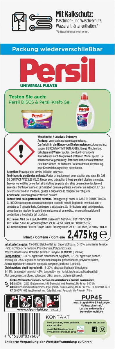 PERSIL Universal Pulver Waschmittel – Kraftvolle Fleckentfernung, intensive Leuchtkraft, lang anhaltende Frische und eine hygienisch frische Maschine Das PERSIL Universal Waschmittel sorgt nicht nur für strahlend saubere Wäsche, sondern überzeugt mit einer leistungsstarken 3-fach-Wirkung: Es entfernt kraftvoll selbst hartnäckige Flecken, verleiht der Kleidung intensive Leuchtkraft und sorgt für lang anhaltende Frische. Darüber hinaus reinigt das Waschpulver nicht nur die Wäsche, sondern bekämpft auch unangenehme Gerüche in der Waschmaschine – für eine hygienisch frische Maschine bei jedem Waschgang. Dank integriertem Kalkschutz und Wasserenthärter* wirkt das Waschmittel auch Ablagerungen an der Maschine und Wäsche entgegen. Die Produktvorteile im Detail: Kraftvolle Fleckentfernung Intensive Leuchtkraft Lang anhaltende Frische Hygienisch frische Maschine Waschkraft bei niedrigen Temperaturen ab 20 °C *Für Wasserhärtegrad weich bis hart. Anwendung: Es sollte immer die Dosieranweisung auf der Verpackung geprüft werden. Die Dosieranweisung ist abhängig von der Größe der Waschmaschine, der Wasserhärte und dem Verschmutzungsgrad der Wäsche. Spartipps für Wasser, Energie, CO₂ und Geld: 1. Vermeiden Sie ein Unterfüllen der Waschmaschine. 2. Dosieranweisungen beachten. 3. Bei niedriger Temperatur waschen. 4. Verpackung aufbewahren Wenn es tiefenrein ist, ist es Persil Seit mehr als 110 Jahren erfreut sich PERSIL größter Beliebtheit und genießt das Vertrauen von Millionen Verbrauchern. Bereits bei der Einführung im Jahr 1907 als erstes selbsttätiges Waschpulver war PERSIL seiner Zeit voraus und setzt seitdem Meilensteine in der Entwicklung neuer und nachhaltiger Waschmittel. Dabei liefern alle Produkte einen entscheidenden Mehrwert, Sie verbinden erstklassige Leistung mit der Verantwortung für Mensch und Umwelt und ermöglichen einen effizienten Einsatz von Ressourcen wie Energie und Wasser.