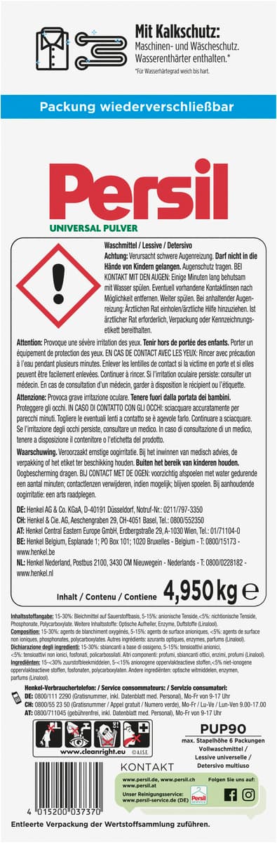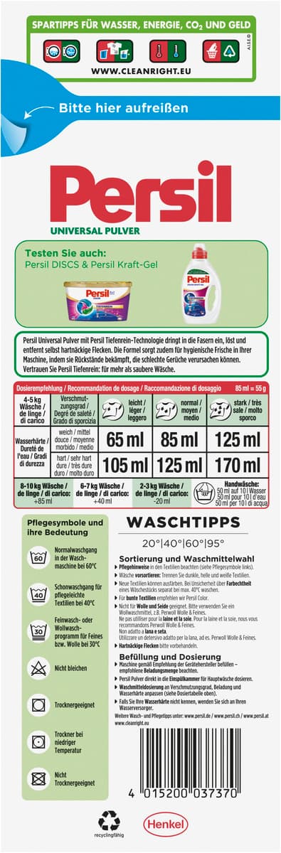 PERSIL Universal Pulver Waschmittel – Kraftvolle Fleckentfernung, intensive Leuchtkraft, lang anhaltende Frische und eine hygienisch frische Maschine Das PERSIL Universal Waschmittel sorgt nicht nur für strahlend saubere Wäsche, sondern überzeugt mit einer leistungsstarken 3-fach-Wirkung: Es entfernt kraftvoll selbst hartnäckige Flecken, verleiht der Kleidung intensive Leuchtkraft und sorgt für lang anhaltende Frische. Darüber hinaus reinigt das Waschpulver nicht nur die Wäsche, sondern bekämpft auch unangenehme Gerüche in der Waschmaschine – für eine hygienisch frische Maschine bei jedem Waschgang. Dank integriertem Kalkschutz und Wasserenthärter* wirkt das Waschmittel auch Ablagerungen an der Maschine und Wäsche entgegen. Die Produktvorteile im Detail: Kraftvolle Fleckentfernung Intensive Leuchtkraft Lang anhaltende Frische Hygienisch frische Maschine Waschkraft bei niedrigen Temperaturen ab 20 °C *Für Wasserhärtegrad weich bis hart. Anwendung: Es sollte immer die Dosieranweisung auf der Verpackung geprüft werden. Die Dosieranweisung ist abhängig von der Größe der Waschmaschine, der Wasserhärte und dem Verschmutzungsgrad der Wäsche. Spartipps für Wasser, Energie, CO₂ und Geld: 1. Vermeiden Sie ein Unterfüllen der Waschmaschine. 2. Dosieranweisungen beachten. 3. Bei niedriger Temperatur waschen. 4. Verpackung aufbewahren Wenn es tiefenrein ist, ist es Persil Seit mehr als 110 Jahren erfreut sich PERSIL größter Beliebtheit und genießt das Vertrauen von Millionen Verbrauchern. Bereits bei der Einführung im Jahr 1907 als erstes selbsttätiges Waschpulver war PERSIL seiner Zeit voraus und setzt seitdem Meilensteine in der Entwicklung neuer und nachhaltiger Waschmittel. Dabei liefern alle Produkte einen entscheidenden Mehrwert, Sie verbinden erstklassige Leistung mit der Verantwortung für Mensch und Umwelt und ermöglichen einen effizienten Einsatz von Ressourcen wie Energie und Wasser.