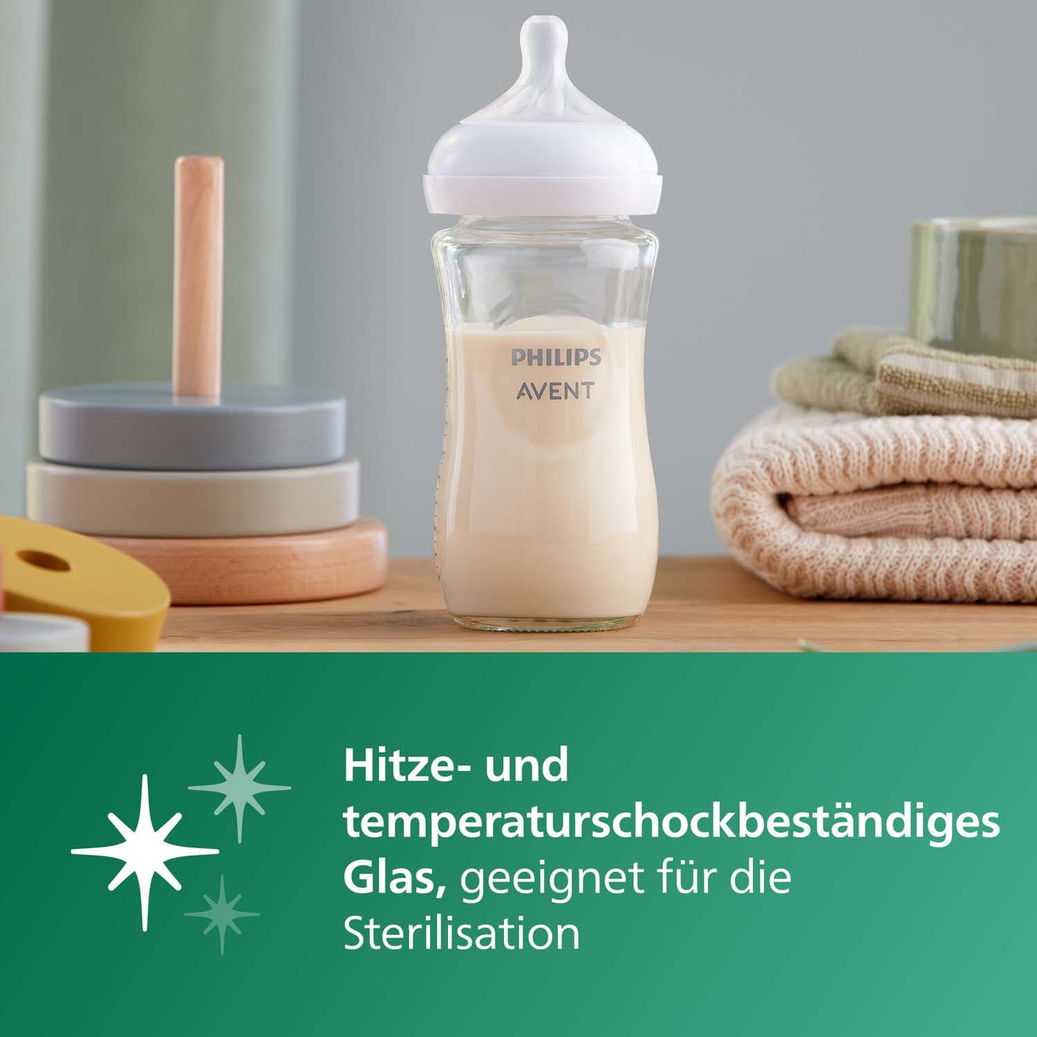 Gefertigt aus hitzebeständigem Borosilikatglas und BPA-frei, sind die Flaschen leicht zu reinigen und sicher zu sterilisieren. Der Sauger ist flexibel, passt sich der Gesichtsform des Babys an und sorgt so für ein natürliches, komfortables Trinkerlebnis. Mit der passenden Durchflussrate wird jede Mahlzeit entspannt und sicher.