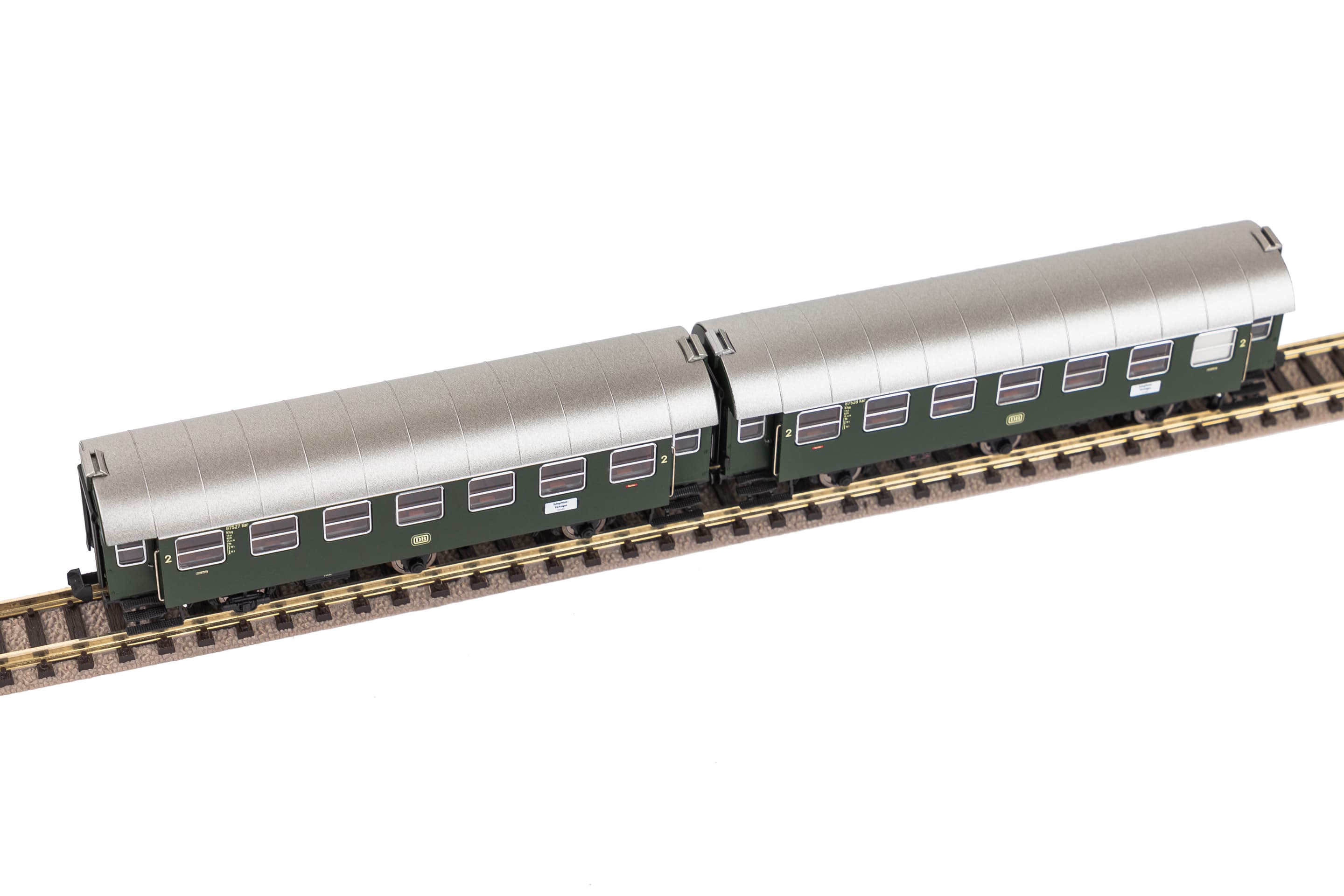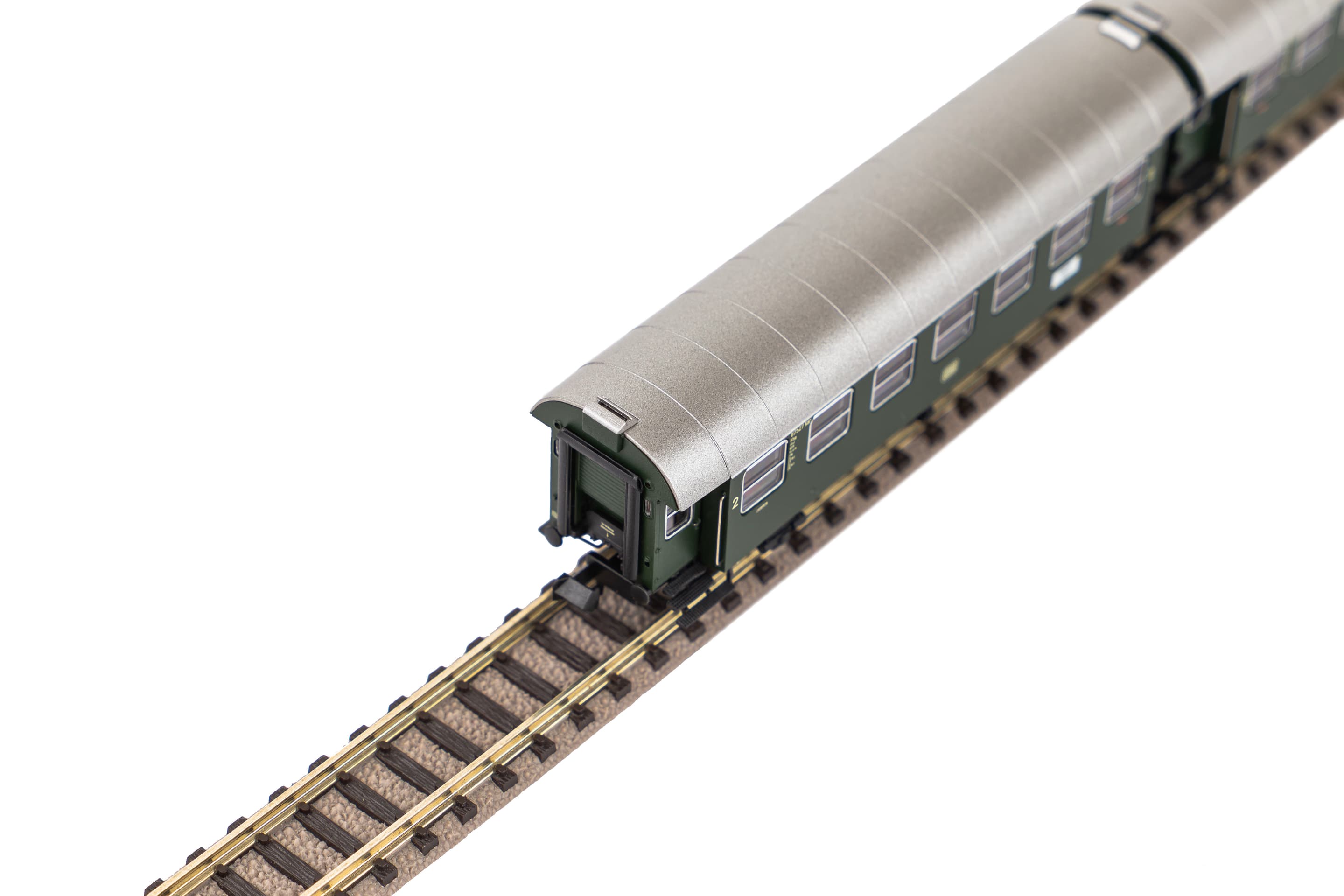 Neuheit 2024: Ab Mitte der 1950er-Jahre entstanden durch Umbau von Länderbahn-Abteilwagen bei der Deutschen Bundesbahn zwei Reisezug-Wagenserien, die als Umbauwagen bezeichnet werden. Anders als beim Vorbild wurde für die PIKO Modelle der dreiachsigen Umbauwagen nicht auf vorhandene Teile zurückgegriffen. Bei den Wagen handelt es sich um vollständige Neukonstruktionen. Die maßstäblichen Fahrzeuge geben das Original bis ins kleinste Detail wieder. Einzeln angesetzte Griffstangen gehören genauso zur zeitgemäßen Konstruktion wie bündig abschließende, glasklare Fenster und eine detaillierte Inneneinrichtung. Die liebevolle Gestaltung setzt sich am Wagenboden fort. Er überzeugt unter anderem durch freistehende Leitungen und ein filigranes Bremsgestänge. Wie das Vorbild erscheinen auch die N Umbauwagen als kurzgekuppelte Pärchen im Handel und verfügen über einen vorbildnahen Abstand zwischen den Wagen. Zusammen mit dem PIKO Lokomotivmodell der Baureihe E 32 (Art.-Nr. 40820) lassen sich vorbildgerechte Zugverbände bilden, die zum absoluten Blickfang auf jeder Anlage werden.