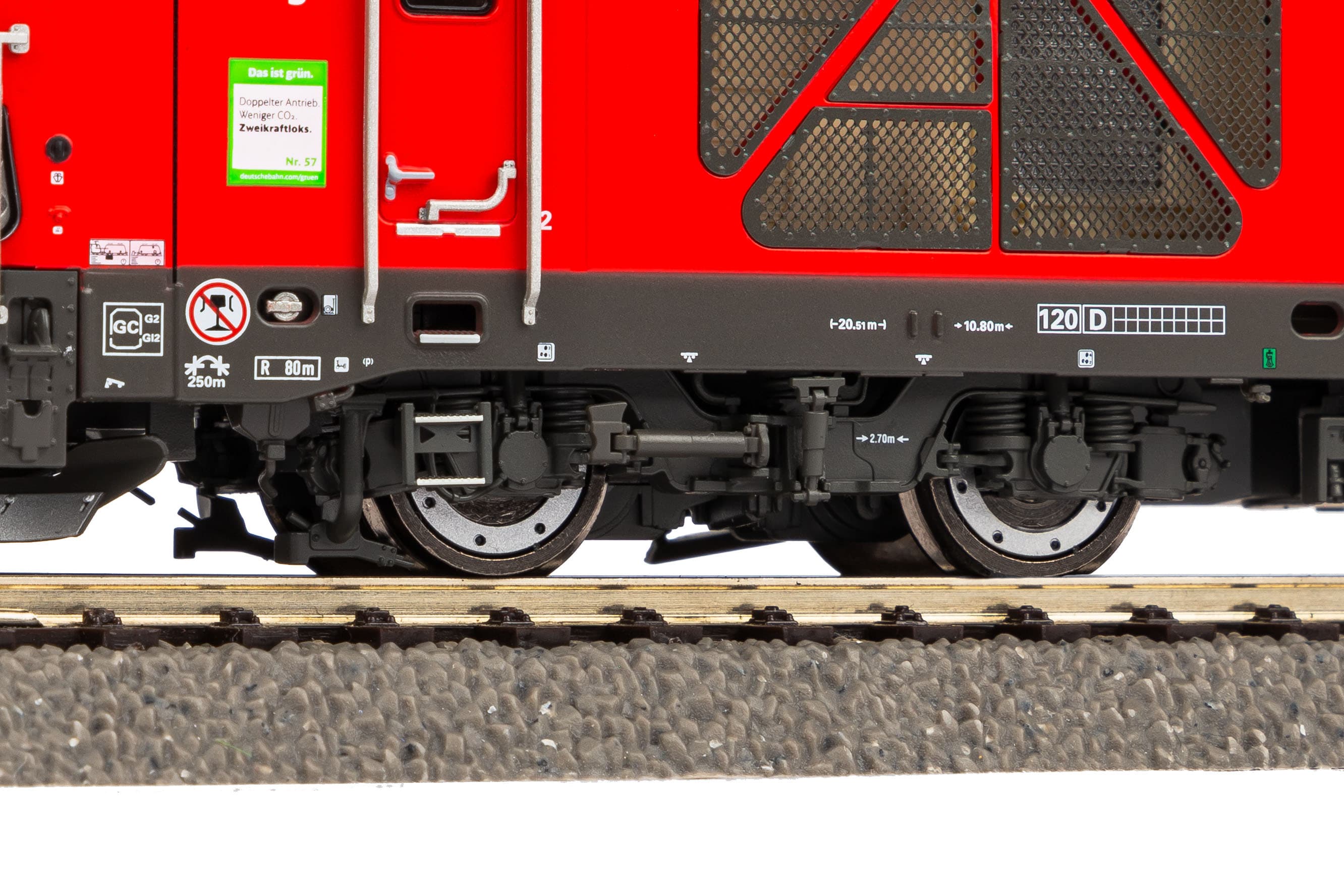 Neuheit 2024: Die großen Seitenflächen mit den markanten Lüftern und das Dach mit einem Stromabnehmer prägen das Erscheinungsbild des modernen Vectron Dual Mode. Großer Wert wurde bei Konstruktion und Werkzeugbau auch auf Details gelegt:äußerst plastisch wirkende Gravuren der Lüftungsgitter und Drehgestelle mit hervorragender optischer Tiefenwirkung unterstreichen dies. Technisch führt das Modell die bewährte Linie der PIKO Konstruktionen fort. Als Antrieb dient ein kräftiger Mittelmotor, zwei Schwungmassen sorgen für hervorragende Laufeigenschaften und diagonal angeordnete Haftreifen ermöglichen die Beförderung langer Züge. Im Digitalbetrieb können Führerstands- und Führerpultbeleuchtung digital geschaltet werden. Hierfür verfügt das Modell ab Werküber einen PSD XP Sound-Decoder, der zudem in Kombination mit dem großen Lautsprecher für besondere Sounderlebnisse auf der Modellbahnanlage sorgt.
