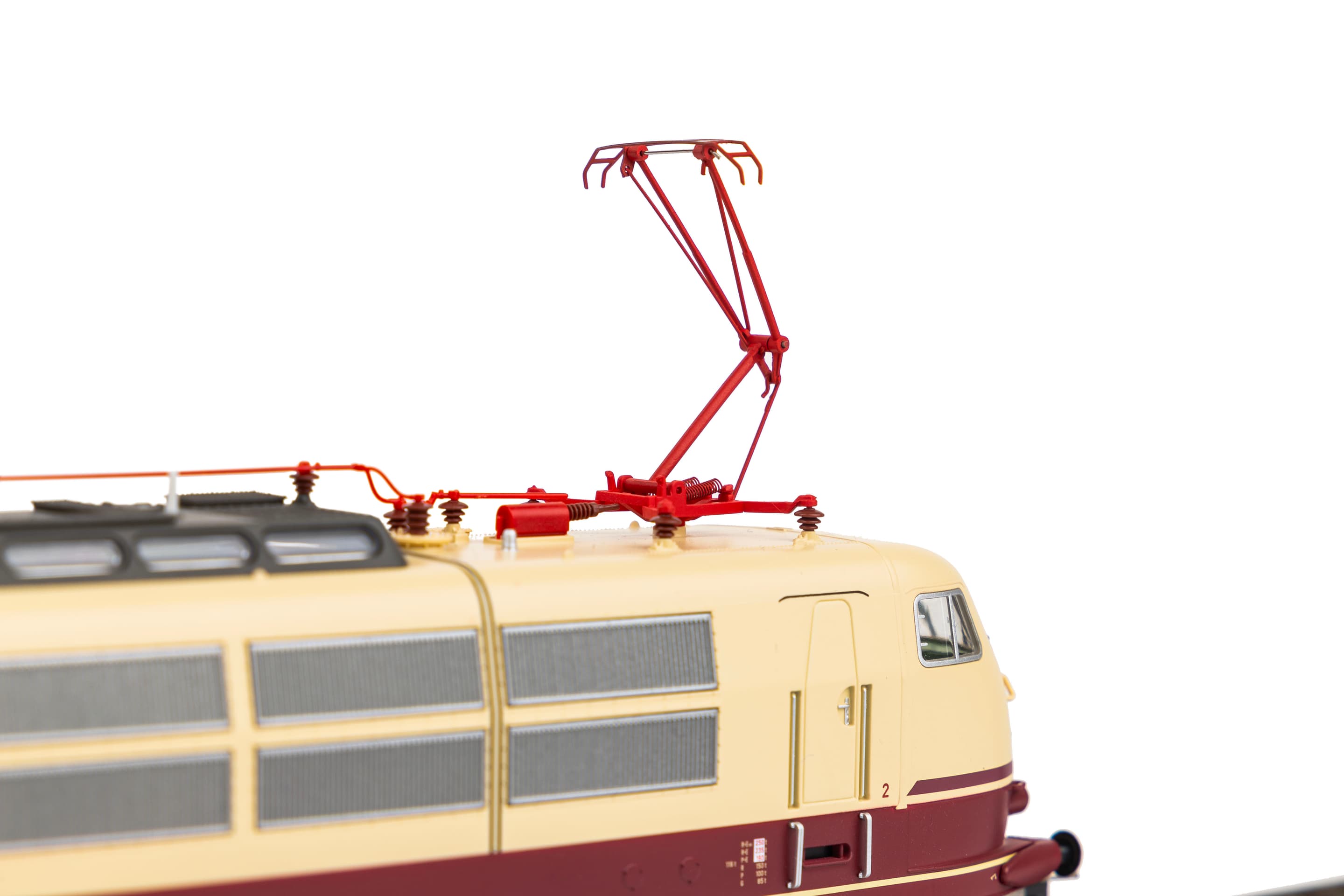 Neuheit 2024: Formvariante der BR 103 als kurze Ausführung der DB in Epoche IV. Das Modellüberzeugt durch einen schweren Metalldruckgussrahmen mit fein detailliertem Gehäuse, feinster Lackierung und Bedruckung und filigranen Metall-Einholmstromabnehmern. Der fünfpolige, kugelgelagerte Motor sorgt mit zwei Schwungmassen für ausgezeichnete Fahreigenschaften. Der LED-Lichtwechsel erfolgt fahrtrichtungsabhängig weiß/rot und ist wie die Führerstandsinnenbeleuchtung mit einem PluX22-Decoder digital schaltbar. Das Modell besitzt ab Werk einen passenden PSD XP Sound-Decoder mit größtmöglichem Lautsprecher.